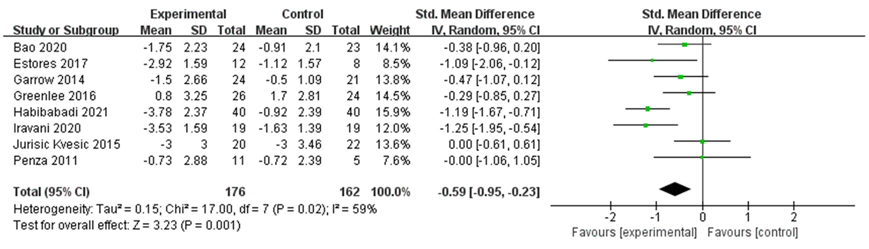 Changes in pain intensity (including changes in VAS, NRS, and BPI-SF worst pain score) occurred in eight RCTs (22, 23, 26, 34, 35, 37, 39, 40) with 338 participants. They investigated the effect of acupuncture on changes in pain intensity, including four trials (22, 26, 39, 40) on conventional manual acupuncture, three trials (23, 35, 37) on auricular acupuncture, and one trial (34) on EA. Using a random effect model among the results (P = 0.02, I2 = 59%), a significant effect was shown in changes in pain intensity in the acupuncture group (SMD −0.59, 95% CI: −0.95 to −0.23, P = 0.001) (Figure 4). Eight trials (19–21, 24, 27, 35, 36, 38) were not pooled in the meta-analysis because one trial (24) did not report complete data and seven trials (19–21, 27, 35, 36, 38) did not report the relative outcome.