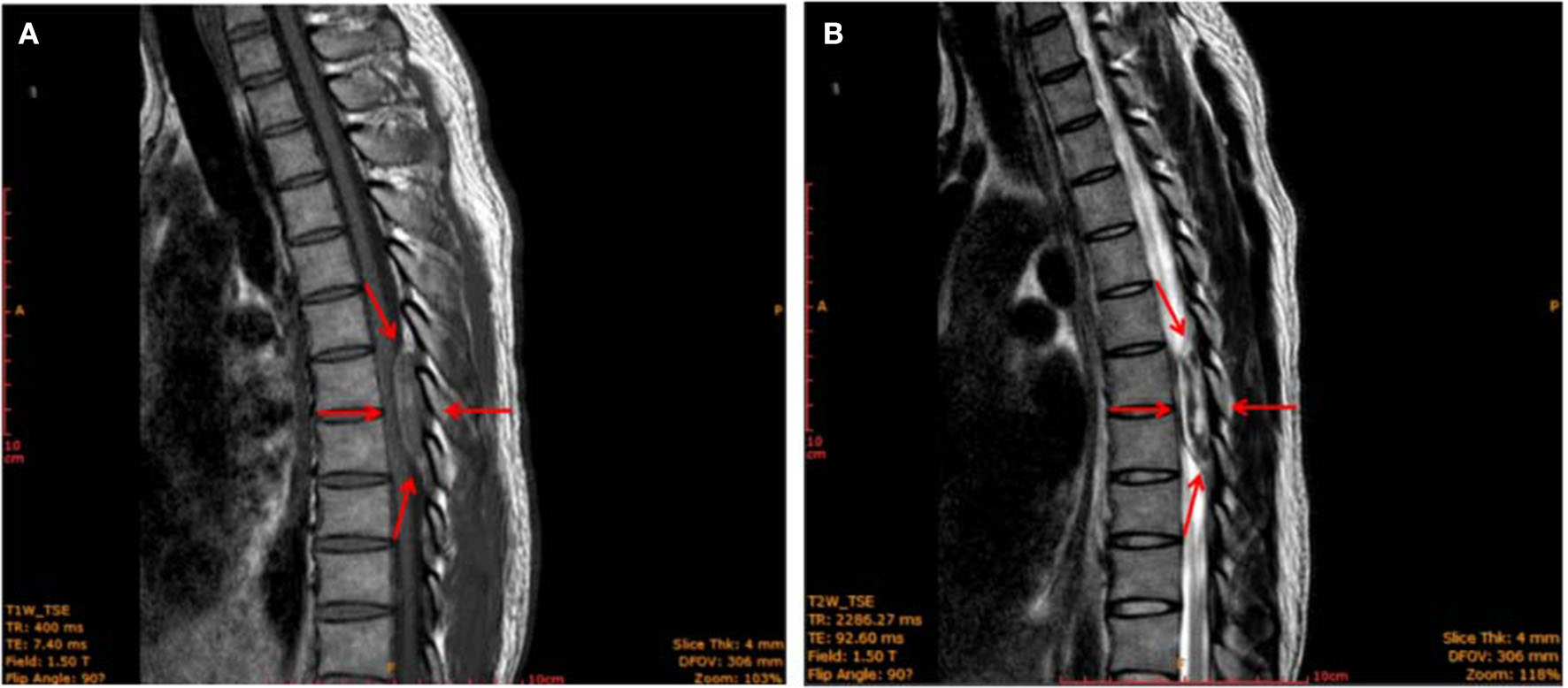 MRI image of the thoracic spine (sagittal plane) showing an epidural mass (red arrows) with a clear border measuring 11 × 16 × 11 mm located at the level of 2 thoracic vertebrae (T7–T8). The mass was iso-intense on T1-weighted images (A) and showed mixed-signal intensity on T2-weighted images (B).