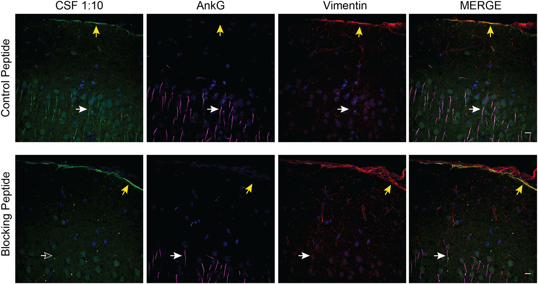Identification of a subpial autoantibody. Case 1 CSF TBIF of murine cortex with control or blocking peptide. Tissue was co-stained with AnkG (magenta) and Vimentin (red) to identify the overlying pial tissue. Yellow arrows point to subpial CSF IgG. White arrows point to an AIS. The empty arrow in the lower left panel indicates the absence of AIS immunostaining. Scale bar = 10 μm.
