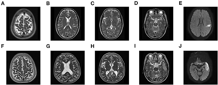 All MR images were performed on a 1.5 T clinical MRI system (MAGNETOM Avanto, SIEMENS, Germany) with an 8-channel head coil. The following MRI sequences were included: T1WI FLAIR [TR/TE = 195/5 ms, inversion time (TI) = 135 ms, slice thickness = 5 mm, slice gap = 6.5 mm, matrix size = 256 × 166, FOV = 187 × 230 mm2]; T2WI TSE (TR/TE = 1,000/82 ms, slice thickness = 5 mm, slice gap = 6.5 mm, matrix size = 256 × 192, FOV = 173 × 230 mm2); T2WI FLAIR (TR/TE = 9,000/96 ms, TI = 6,237 ms, slice thickness = 5 mm, slice gap = 6.5 mm, matrix size = 256 × 156, FOV = 211 × 260 mm2); and DWI (TR/TE = 3,133/89 ms, flip angle = 90°, slice thickness = 5 mm, slice gap = 6.5 mm, matrix = 192 × 192, FOV = 230 × 230 mm2, b value =0, 800 s/mm2 along three orthogonal directions).