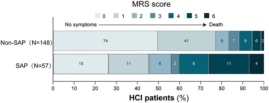 Patients with poor outcomes more frequently had a history of hypertension, diabetes, previous stroke, and dysphagia, and a higher NIHSS score and were more likely to have poor consciousness status on admission (all P < 0.05). Poor outcome patients had a larger core infarct volume, higher brain atrophy score, WMLs score and BG-dPVS score, and more frequently had multiple lobes involved (all P < 0.05). Furthermore, higher absolute count of white blood cells and neutrophils, and NLR, fasting plasma glucose levels, and lower albumin levels were significantly more likely in those who went on to develop a poor outcome (all P < 0.05). Similar to SAP results, no significant difference in the treatment methods were noted between the poor outcome group and the good outcome group (P = 0.162). Patients with poor outcomes had a more frequent occurrence of SAP (P < 0.001). The detailed distribution of functional outcomes at 3 months in patients with and without SAP was shown in Figure 3.