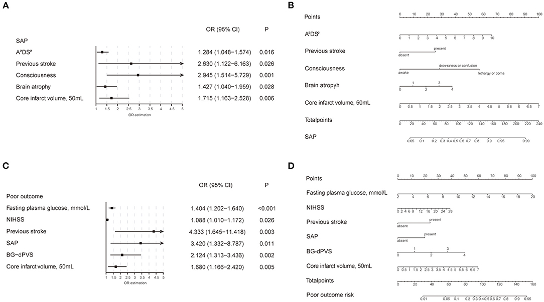 Figure 4. Forest plot and nomogram of independent predictors of SAP and poor outcome. (A) Forest plot of independent predictors of SAP with a multivariate regression model. (B) The SAP model presented with a nomogram scaled by the proportional regression coefficient of each predictor. (C) Forest plot of independent predictors of poor outcome with a multivariate regression model. (D) The poor outcome model presented with a nomogram scaled by the proportional regression coefficient of each predictor. SAP, stroke-associated pneumonia; NIHSS, National Institute of Health stroke scale; BG-dPVS, basal ganglia dilated perivascular space; OR, odds ratio.