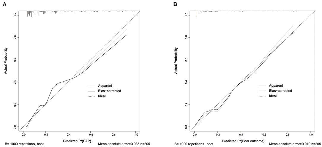 Figure 5. Calibration curve of SAP and poor outcome models in data. (A) Calibration curve of the SAP model. (B) Calibration curve of the outcome model. SAP, stroke-associated pneumonia.