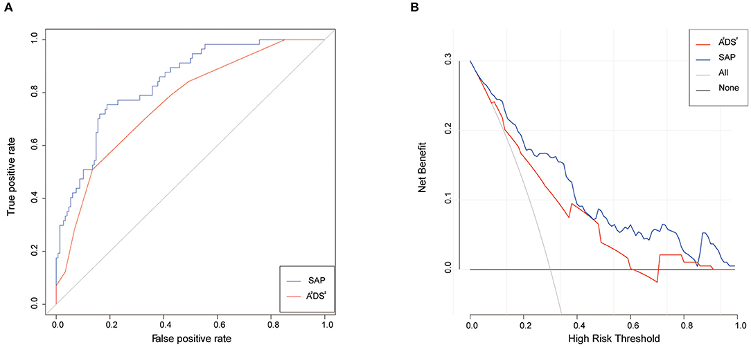 The A2DS2 score yielded a C-statistic of 0.76 (95% CI 0.69–0.83) for the prediction of the occurrence of SAP. However, the C-statistic of the SAP model was 0.84 (95% CI 0.78–0.90), which was much higher than the A2DS2 scale (Figure 6A). The chi-square test yielded a significant difference between the A2DS2 score and the SAP model (P < 0.001). The decision curve analysis for the SAP model and A2DS2 score is presented in Figure 6B. The decision curve showed that using the SAP model to predict the occurrence of SAP adds more benefit than either the treat-all-patients scheme or the treat-none scheme, compared with the A2DS2 score.