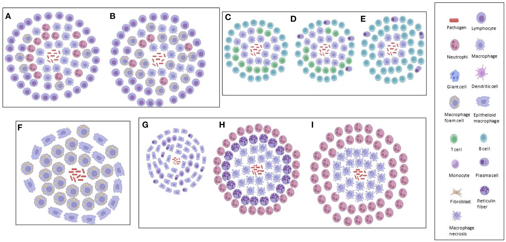 Graphical illustrations of TB granulomas based upon key cellular elements in their categorizations, based upon literature. (A) Primary granuloma. (B) Secondary granuloma. (C) Type 1 granuloma. (D) Type II granuloma. (E) Type III granuloma. (F) Early granuloma. (G) Non-necrotizing granuloma. (H) Necrotizing gummatous granuloma. (I) Necrotizing abscess granuloma.