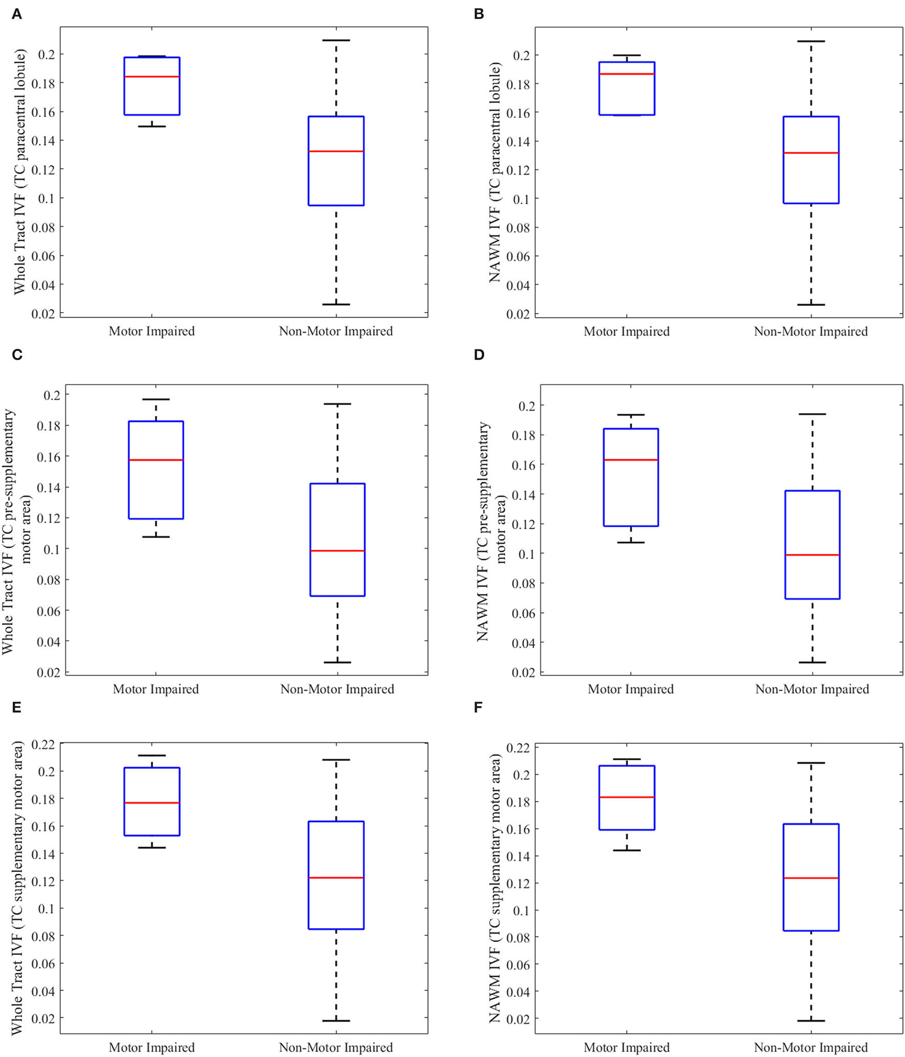 Boxplots of tract metrics which were significantly different between person with multiple sclerosis with and without motor impairment. The isotropic volume fraction (IVF) values measured in the whole tract and normal appearing white matter (NAWM) of the transcallosal (TC) paracentral lobule (A,B), TC presupplementary area (C,D), and TC supplementary motor area tracts (E,F) in person with multiple sclerosis (pwMS) and motor impairment and those without motor impairment. (A,C,E) show whole-tract IVF values, while (B,D,F) show normal appearing white matter (NAWM) IVF values. The upper and lower black horizontal bars represent maximum and minimum values, respectively. The upper and lower blue horizontal bars represent the upper and lower quartiles, while the red bar represents the median of the group.