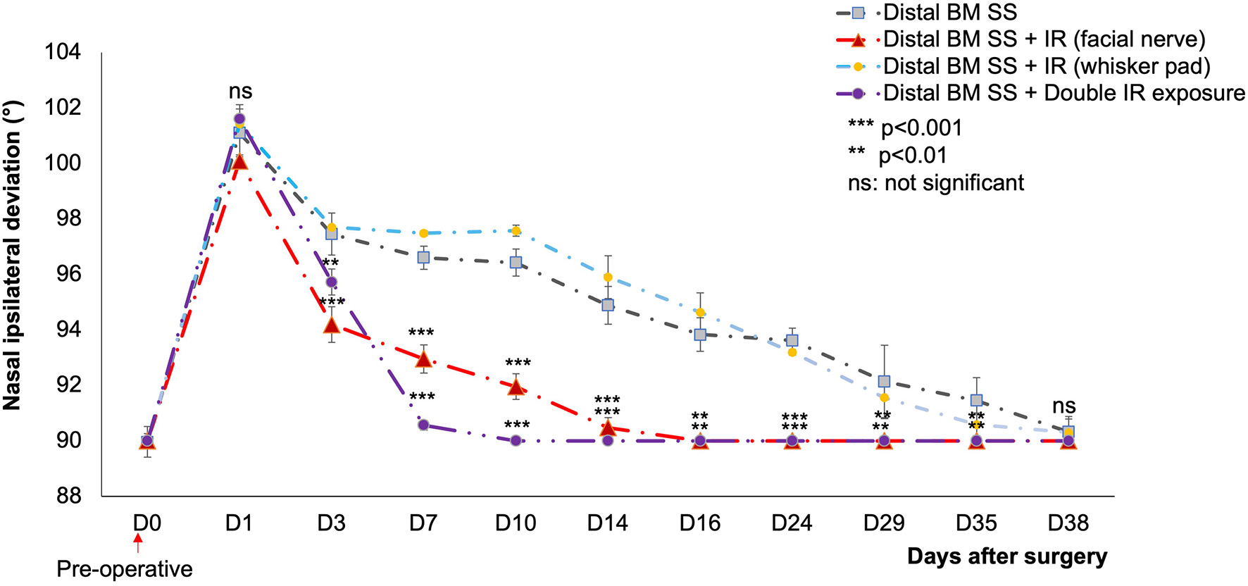 3) Proximal B SS: a proximal section-suture of the buccal branch (B) was performed 10 mm distal to the main trunk of the facial nerve in order to evaluate the effect of IR treatment on the eyelid closure.