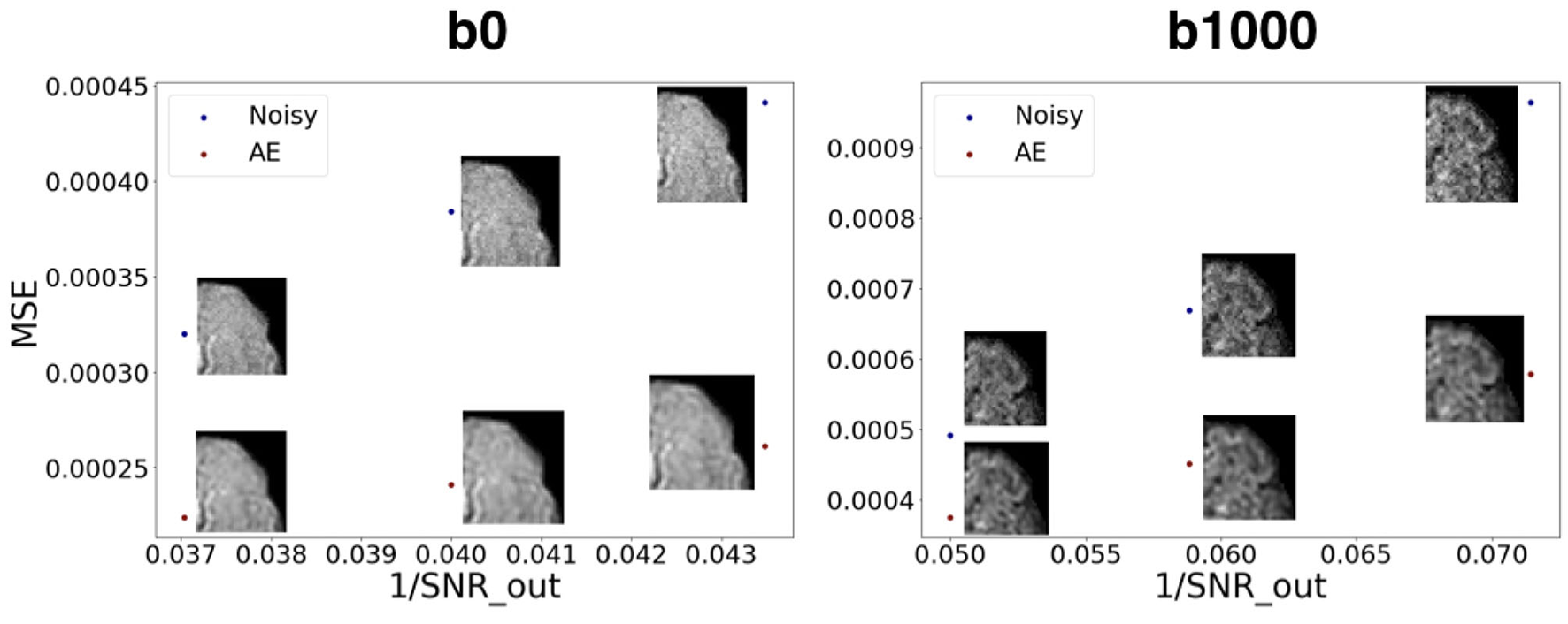 Robustness to noise- We computed with respect to the GT signal, the error of the signal with noise, and the output of the autoencoder using the signal with noise as input. We compared the results using MSE separately for b0 and b1000.