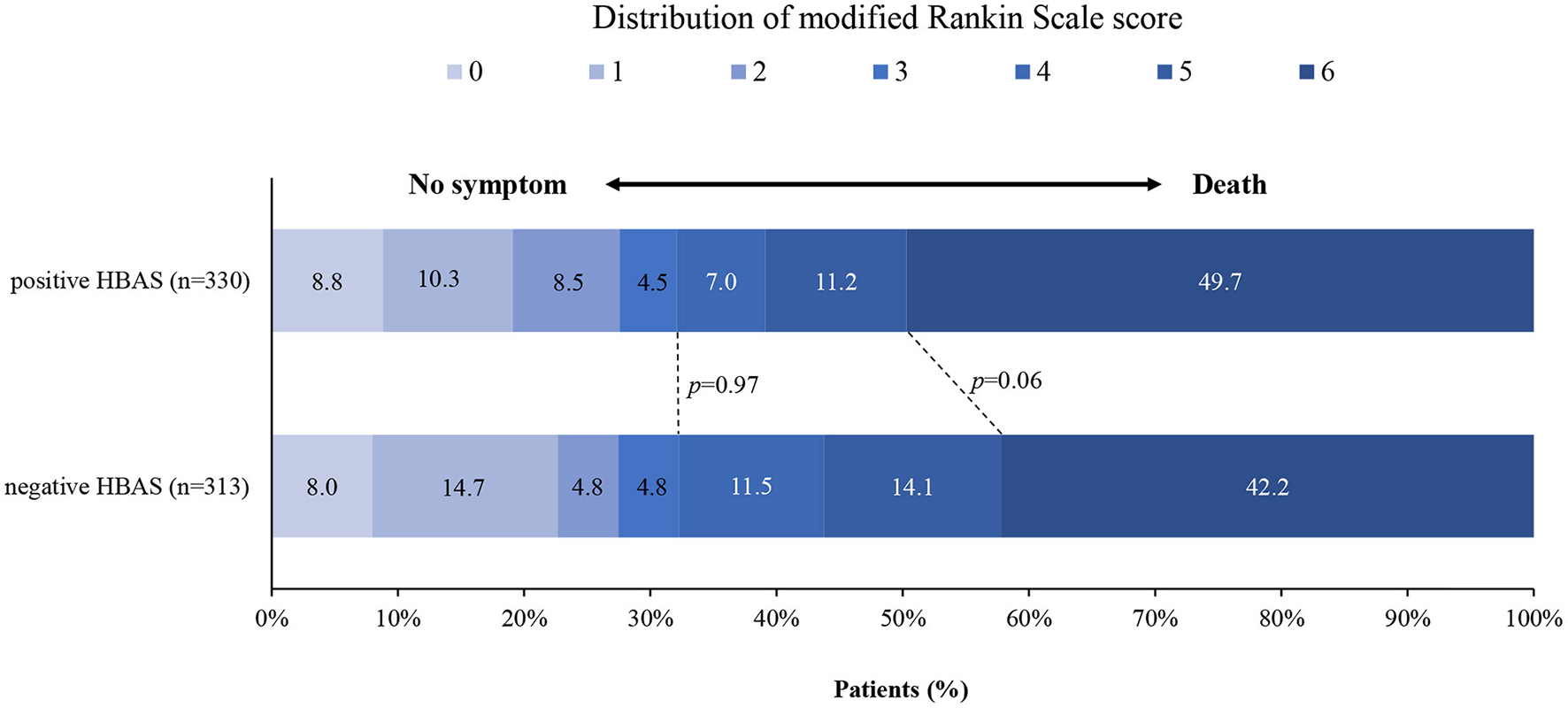 Distribution of the modified Rankin scale (mRS) score at 90 days in patients with negative and positive hyperdense basilar artery sign (HBAS) who underwent EVT. The distribution showed that when compared with negative HBAS, there were no significant differences in favorable outcomes and mortality for patients with HBAS.