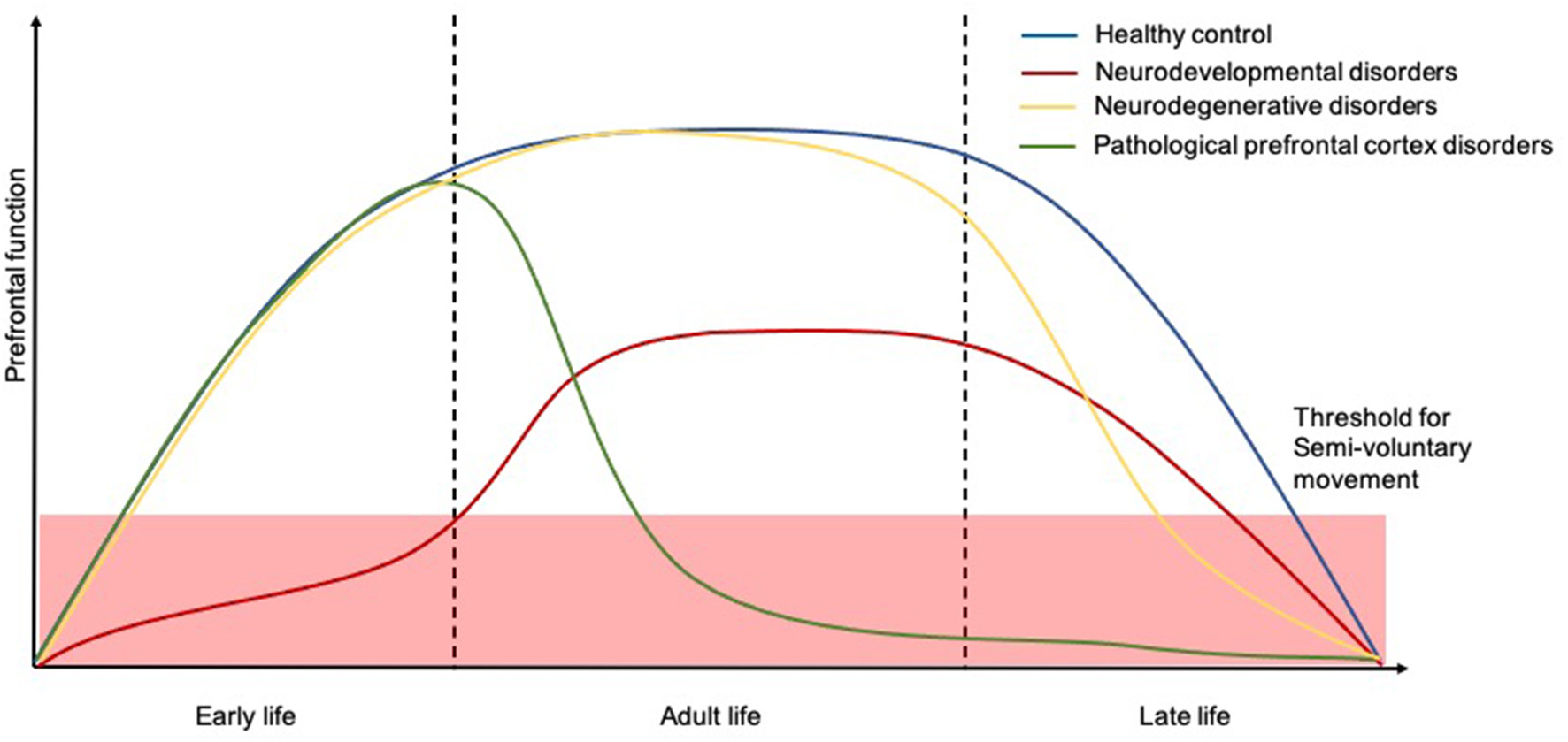 Figure 4. Temporal trajectories of the relationship between human prefrontal function and course of semivoluntary movement. The x-axis shows time and the y-axis shows the relative human prefrontal function. The schematic illustrates how prefrontal function in people with neurodevelopmental disorders (red), neurodegenerative disorders (yellow), and other pathological prefrontal cortex disorders (green) might decline, for which the semivoluntary movement (under the threshold) will begin to emerge compared to healthy population (blue).