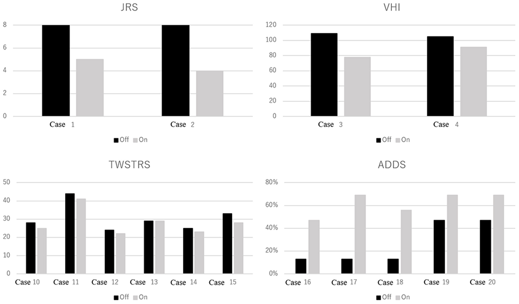 Focal dystonia rating scale scores with and without medication. JRS, Jankovic Rating Scale. Range: 0–8. Higher scores indicate greater blepharospasm severity. VHI, Voice Handicap Index. Range: 0–120. Higher scores indicate greater voice-related handicap in patients with spasmodic dysphonia. TWSTRS, Toronto Western Spasmodic Torticollis Rating Scale. Range: 0–85. Higher scores indicate greater severity, disability, and pain in patients with cervical dystonia. ADDS, Arm Dystonia Disability Scale. Range: 0–100%. Lower scores indicate greater disability in patients with focal hand dystonia.