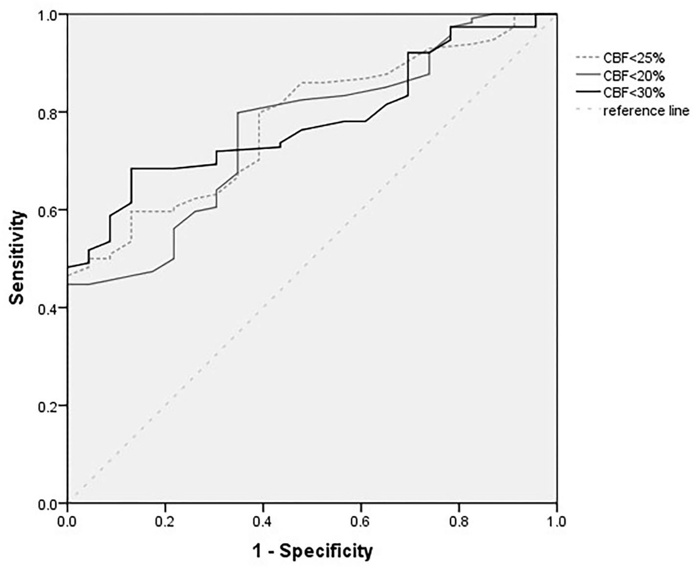 The ischemic core volume based on CTP was 96.9 ± 47.1 ml (CBF < 30%), 79.8 ± 43.7 ml (CBF < 25%), and 62.5 ± 39.1 ml (CBF < 20%).