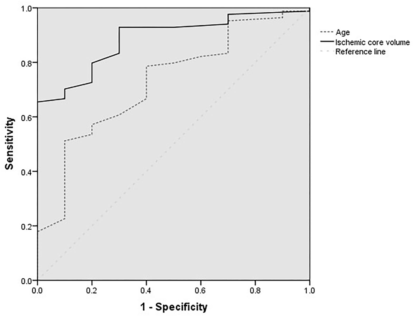 We analyzed data from the anterior circulation database of our hospital (August 2018–June 2021). Multivariate logistic regression analyses identified the predictors of clinical outcomes for patients with large baseline infarcts (>50 ml) assessed by the MIStar software. The receiver operating characteristic (ROC) analysis was used to explore the cutoff value of factors.
