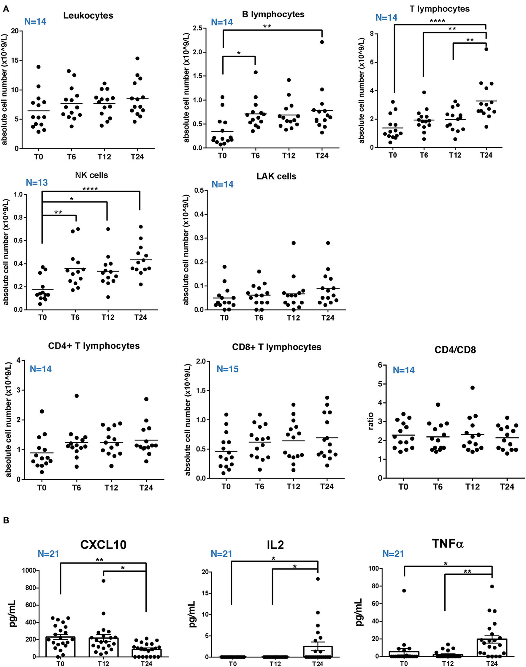 Absolute cell counts of circulating lymphocytes and serum cytokines level in RRMS patients under natalizumab. (A) Percentage and absolute cell count of total T, B, natural killer (NK), lymphokine-activated killer (LAK) cells, and the ratio between CD4 and CD8 T cells (CD4/CD8) at baseline (T0) and after 6, 12, or 24 (T6, T12, and T24) months of natalizumab (NTZ) treatment. Each dot represents a patient. Patients' number is shown in blue for each graph. Mean ± SEM is reported. Statistical significance was determined by one-way ANOVA followed by post-hoc Tukey test (*p < 0.05; **p < 0.01; and ****p < 0.0001). (B) Concentration (pg/ml) of CXCL10, TNFα, and IL2 in serum of patients with RRMS at T0 or at T12 and T24 of NTZ treatment. Each dot represents a patient. Patients' number is shown in blue for each graph. Mean ± SEM is reported. Statistical significance was determined by one-way ANOVA followed by post-hoc Tukey test (*p < 0.05; **p < 0.01).