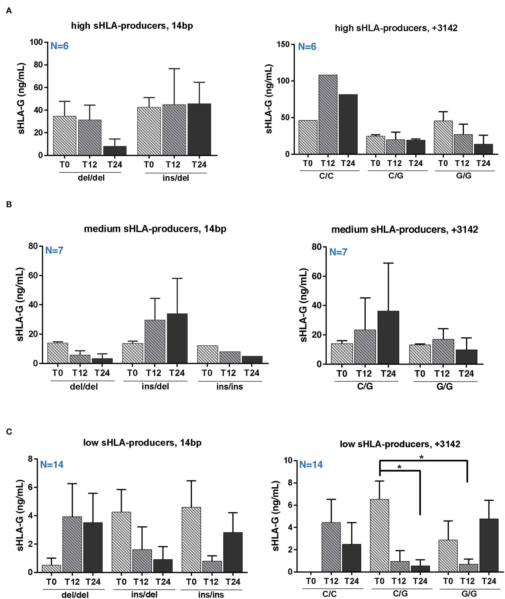 In summary, genotype polymorphism distribution does not significantly differ among sHLA-G producers; of note, 14 bp I/I genotype is not present among high producers, and +3142 C/C among medium producers.