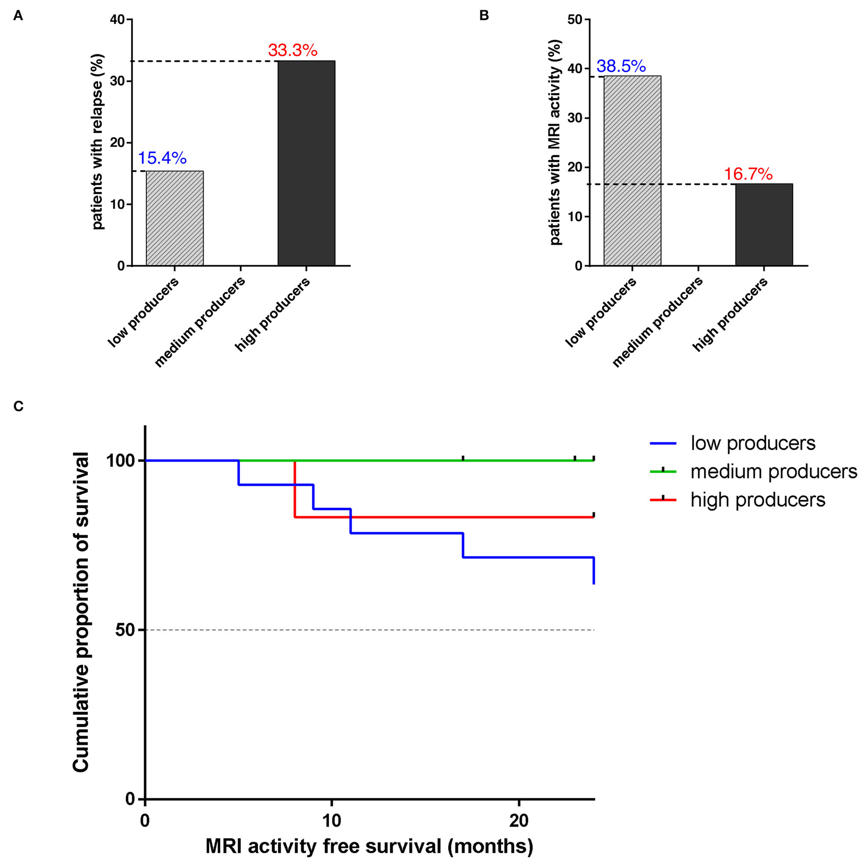 The occurrence of relapses is rare during NTZ treatment (37). In our sample, among high producers, 2/6 (33.3%) experienced a relapse; among medium producers, 1/7 was lost from follow-up at 17 months and no one of the other 6 patients experienced a relapse. On the other hand, 2/13 (1/14 was lost from follow-up at 17 months) low producers relapsed (15.4%) (Figure 4A). Patient MRI shows that 5/13 low producers had new T2 lesions and, among them, 2/5 had Gd-enhancing lesions at follow-up scan. Among these, 2 had a relapse. Concerning other groups, only 1 high producer showed Gd-enhancing lesions or T2 new lesions (Figure 4B). Differences among producers were not statistically significant.