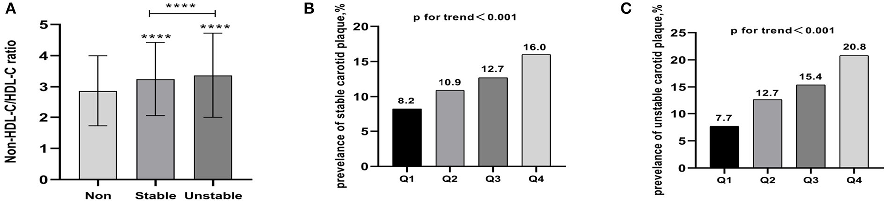 Figure 1. (A) The mean non-HDL-C /HDL-C ratios of non-carotid plaque, stable carotid plaque, and unstable carotid plaque (mean ± SD) increased gradually and this trend was statistically significant. (B) Prevalence of stable carotid plaque stratified by quartile the non-HDL-C/HDL-C ratio. (C) Prevalence of unstable carotid plaque stratified by quartile the non-HDL-C/HDL-C ratio. **** p < 0.001.