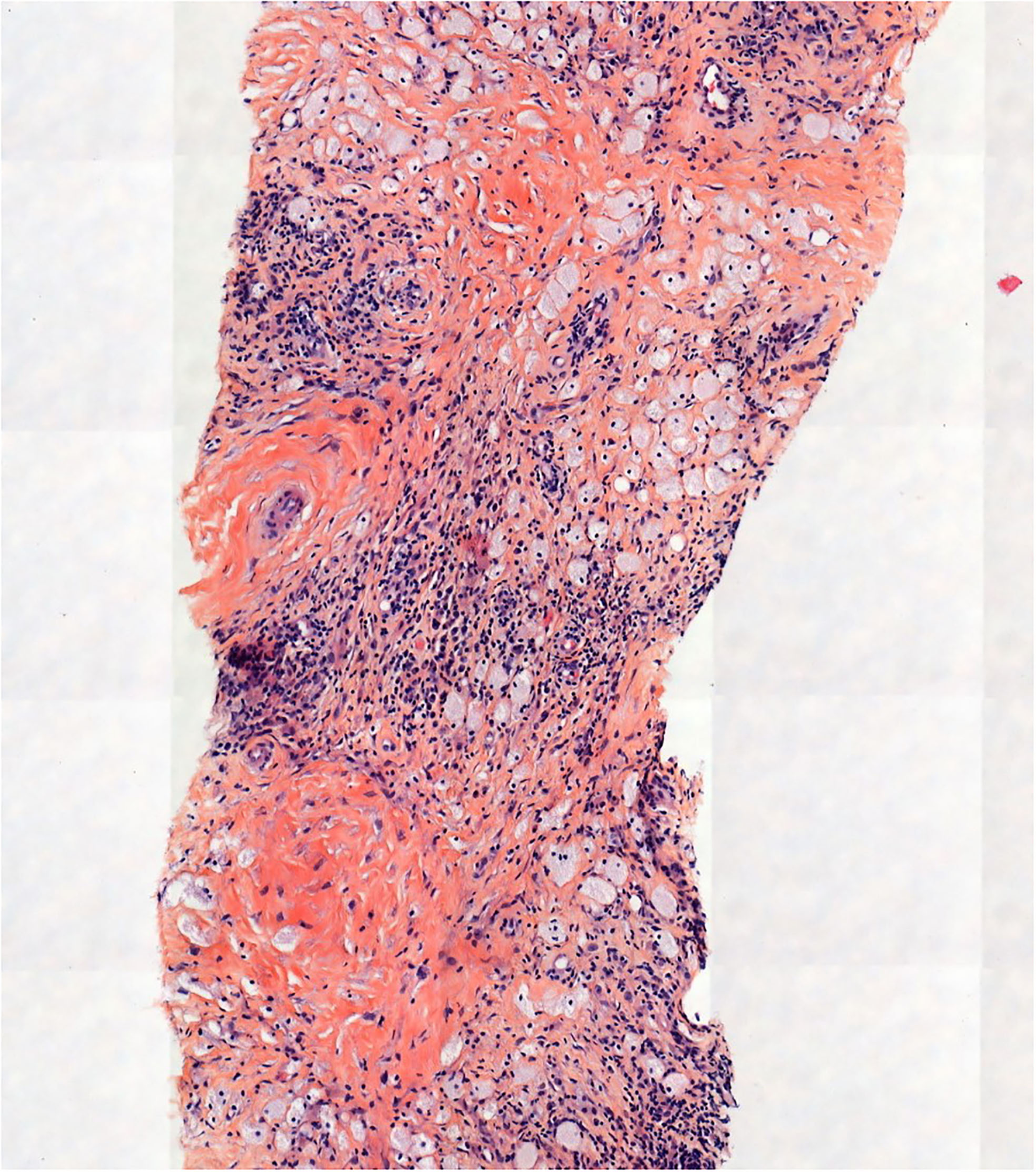 The diagnosis of ECD is based on a combination of histopathological, clinical and radiological features. Classic solid lesions show an infiltration of typically foamy or spumous lipid-laden histiocytes with admixed or surrounding fibrosis (2). In ECD, tissues are infiltrated by foamy CD68(+), CD163(+), Factor XIIIa(+), CD1a(–), and Langerin(–) fibrotic histiocytes.