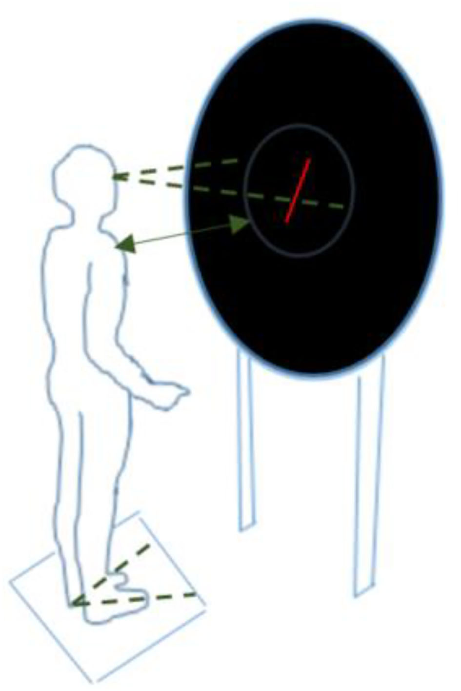 The Subjective Visual Vertical (SVV) test measures patients' perception of verticality in the absence of visual reference points. The experimental setup is shown in Figure 1. The patient was asked to reposition a red line (6 cm length) on a black background until they felt it matched the true vertical. This was done using a handheld remote control and without moving the head or body. The test was done twice with the line initially tilted 20 degrees to the left, and twice with the line tilted 20 degrees to the right. More information on the test conditions can be found in the (Supplementary Table 1). Performance was expressed as the mean absolute misalignment (in degrees) with the gravitational vertical (0°) for these four tests.