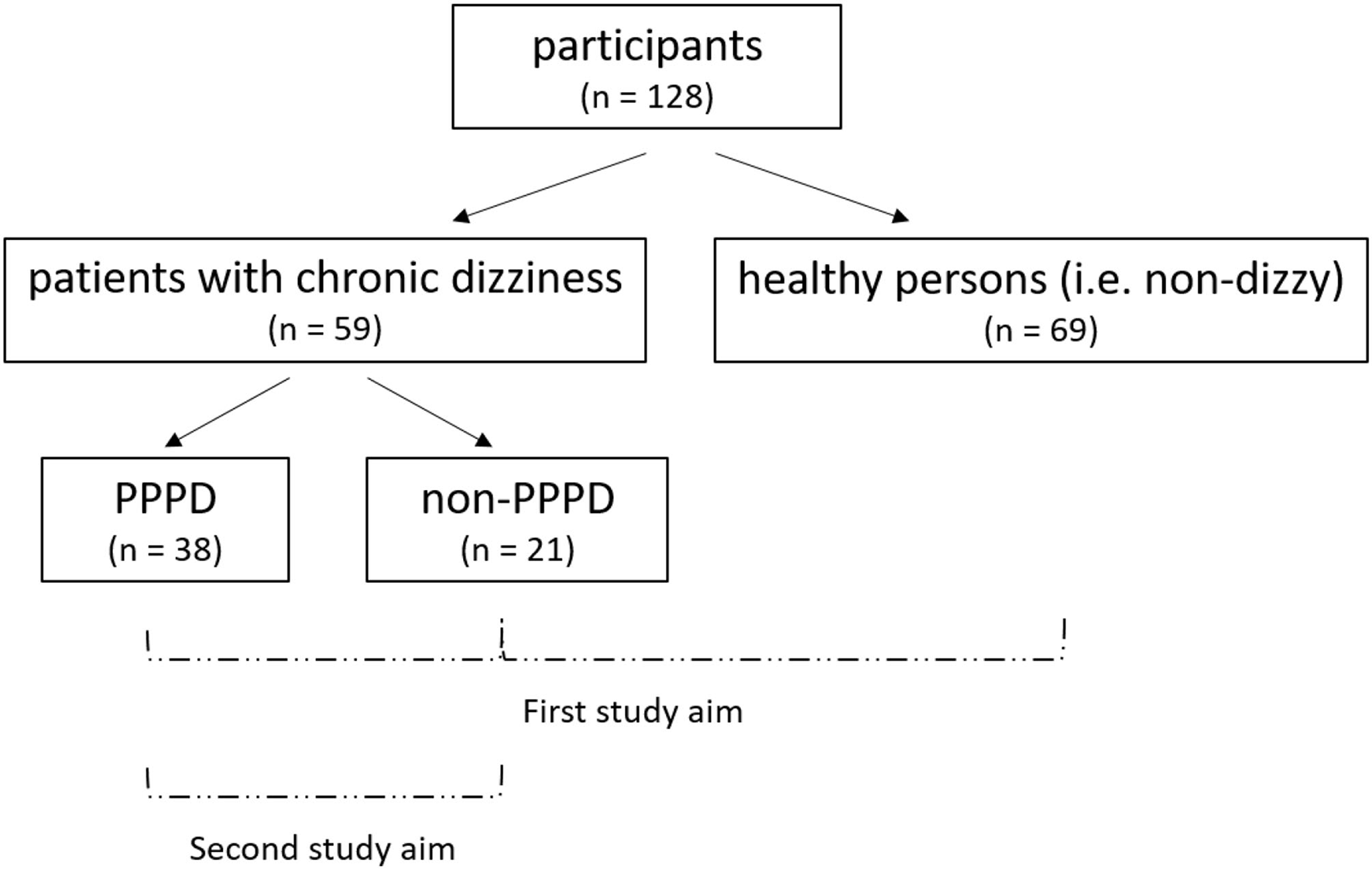 Overview of the recruited samples and study aimsa. First study aim: comparison of the clinical balance and visual dependence tests between PPPD patients, dizzy non-PPPD patients, and healthy persons. Second study aim: evaluation whether these clinical tests can help to identify PPPD in patients with chronic dizziness. aPPPD, persistent postural-perceptual dizziness.