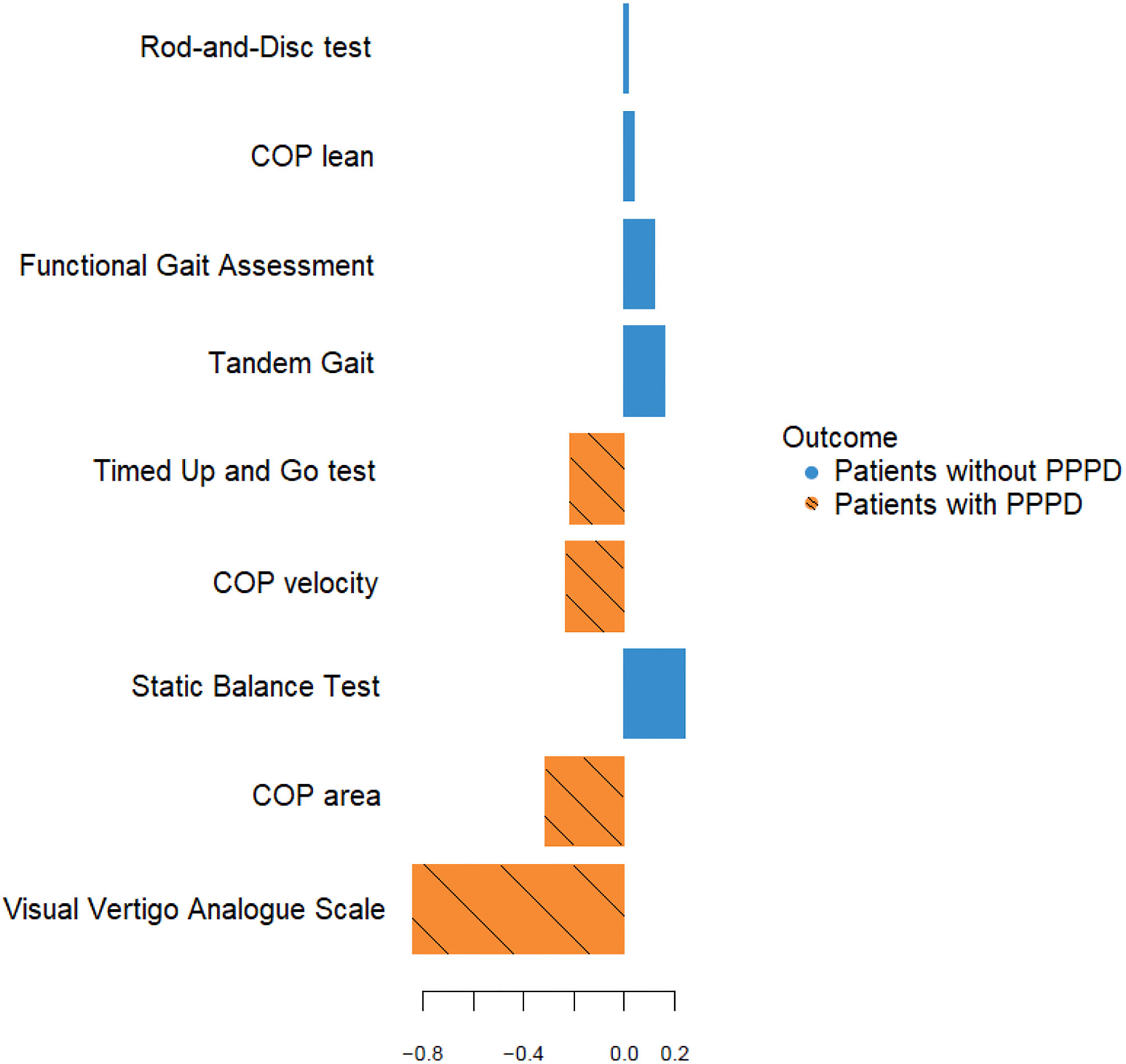 PPPD patients had significantly higher VVAS scores than dizzy non-PPPD patients (p = 0.006). Facing rotating dots, PPPD and dizzy non-PPPD patients had increased postural sway compared to healthy persons (PPPD vs. healthy: center of pressure (COP) velocity p < 0.001, and COP area p < 0.001; but non-PPPD vs. healthy: COP velocity p = 0.116 and COP area p = 0.207). PPPD patients had no significantly increased postural sway compared to dizzy non-PPPD patients. PPPD and dizzy non-PPPD patients also scored significantly worse on balance tests compared to healthy persons (PPPD vs. healthy: for all balance tests p < 0.001; non-PPPD vs. healthy: FGA p < 0.001, for all other tests p < 0.05). Differences were insignificant in balance scores between PPPD and dizzy non-PPPD patients, or in RDT scores between the three study groups. In patients with chronic dizziness, a higher VVAS score was most associated with PPPD [odds ratio 1.04; 95% CI (1.01; 1.07); p = 0.010]. The cross-validated (CV) PLS-DA model with all clinical tests included, had fair discriminative ability (CVerror = 47%).