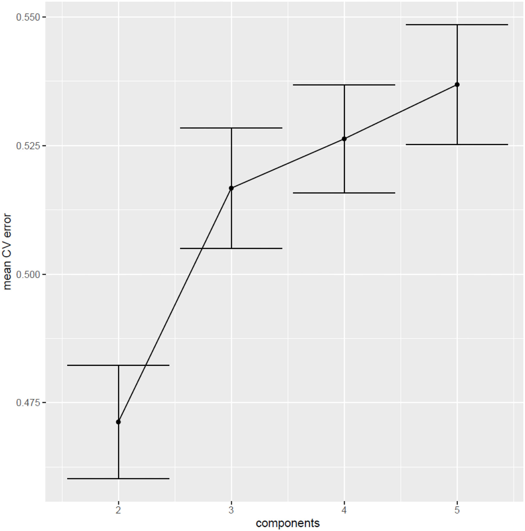 Univariable logistic regression and Partial Least Squares Discriminant Analysis (PLS-DA) models were fitted to determine the predictors of PPPD in patients with chronic dizziness. The relation between the clinical tests and PPPD was expressed as odds ratios [95% confidence interval (CI)], area under the receiver operating characteristic curve (AUC), and optimal cut-off with corresponding sensitivity and specificity (according to maximization of the Youden index). For the PLS-DA model, the potential of each of the clinical tests to discriminate between PPPD and dizzy non-PPPD patients was evaluated through their loading values. The overall discriminative value of the PLS-DA model was 5-fold cross-validated (CV) (24). In brief, for each fold we included 80% of the observations in the training set and 20% in the validation set. The training set was used to fit the PLS-DA models, with the number of components ranging from 2 to 10. Subsequently, these models predicted the outcome from the observations in the validation set, and the percentage of error (CVerror) was registered. This was carried out in 5-fold, with each individual observation belonging to the validation set exactly one time. The 5-fold CV was repeated 500 times to obtain the standard error of the CVerror.