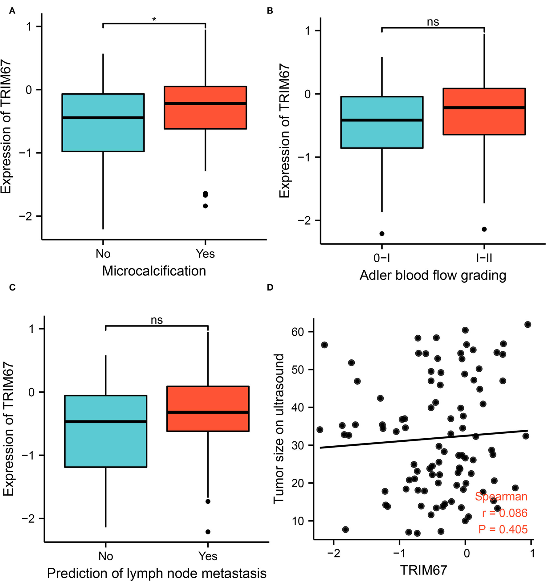 Tripartite motif-containing protein 67 (TRIM67) was identified and the differential; in addition, the survival analyses of the TCGA database revealed that it was associated with brain tumor metastases and overall survival prognosis. Applying independent clinical cohort data, US-related features (microcalcification and lymph node metastasis) were associated with breast cancer tumor metastasis. Furthermore, ultrasonographic findings of microcalcifications showed correlations with TRIM67 expression. The study results revealed that six variables [stage, TRIM67, tumor size, regional lymph node staging (N), age, and HER2 status] were suitable predictors of tumor metastasis by applying support vector machine–recursive feature elimination. Among these, US-predicted tumor size correlated with tumor size classification, whereas US-predicted lymph node metastasis correlated with tumor N classification. The TRIM67 upregulation was accompanied by upregulation of the integrated breast cancer pathway; however, it leads to the downregulation of the miRNA targets in ECM and membrane receptors and the miRNAs involved in DNA damage response pathways.