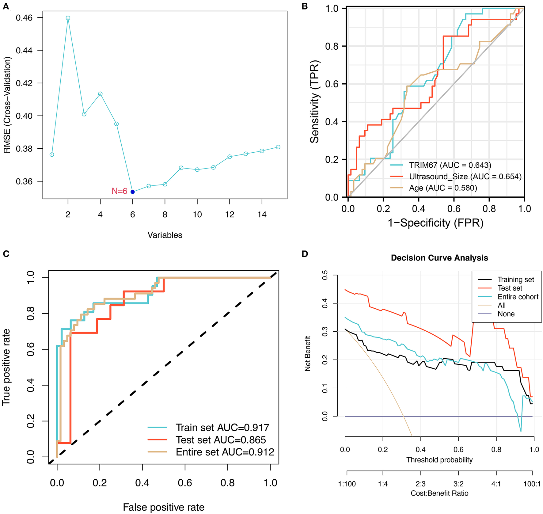Typically, the logistics model is used to screen for risk factors associated with the poor outcomes. In this section, we have included only general clinical features and ultrasonography-related features for analysis to explore the ability of preoperative ultrasonography and diagnosis to assess the likelihood of DM in patients with tumors. Results of logistic regression analysis to screen the predictors associated with DM are presented in Table 2. Univariate logistic analysis showed that tumor size in US imaging (p = 0.015), microcalcification (p < 0.001), Adler blood flow grading (p = 0.003), and lymph node metastasis (p = 0.001) were significantly associated with the occurrence of DM in patients with breast cancer. Further multivariate logistic regression analysis showed that microcalcification (p = 0.02) and lymph node metastasis (p = 0.011) were independent predictors of DM.