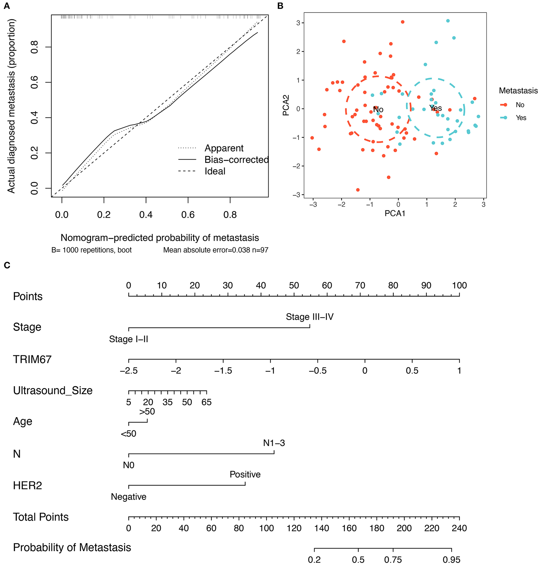 A principal component analysis (PCA) was applied to further extract features from the SVM–RFE that reflect tumor metastasis in order to determine whether they provided adequate information for classification. To develop predictive models for these characteristics, multivariate logistic regression was applied. Decision curve analysis (DCA) assesses the usefulness and safety of clinical prediction models by calculating the net benefit ratio for different threshold probabilities. To facilitate clinical use, a visualization tool was constructed by applying the “rms” to the nomogram of this clinical prediction model. Calibration curves are used to assess the agreement between predicted probabilities and actual outcomes.