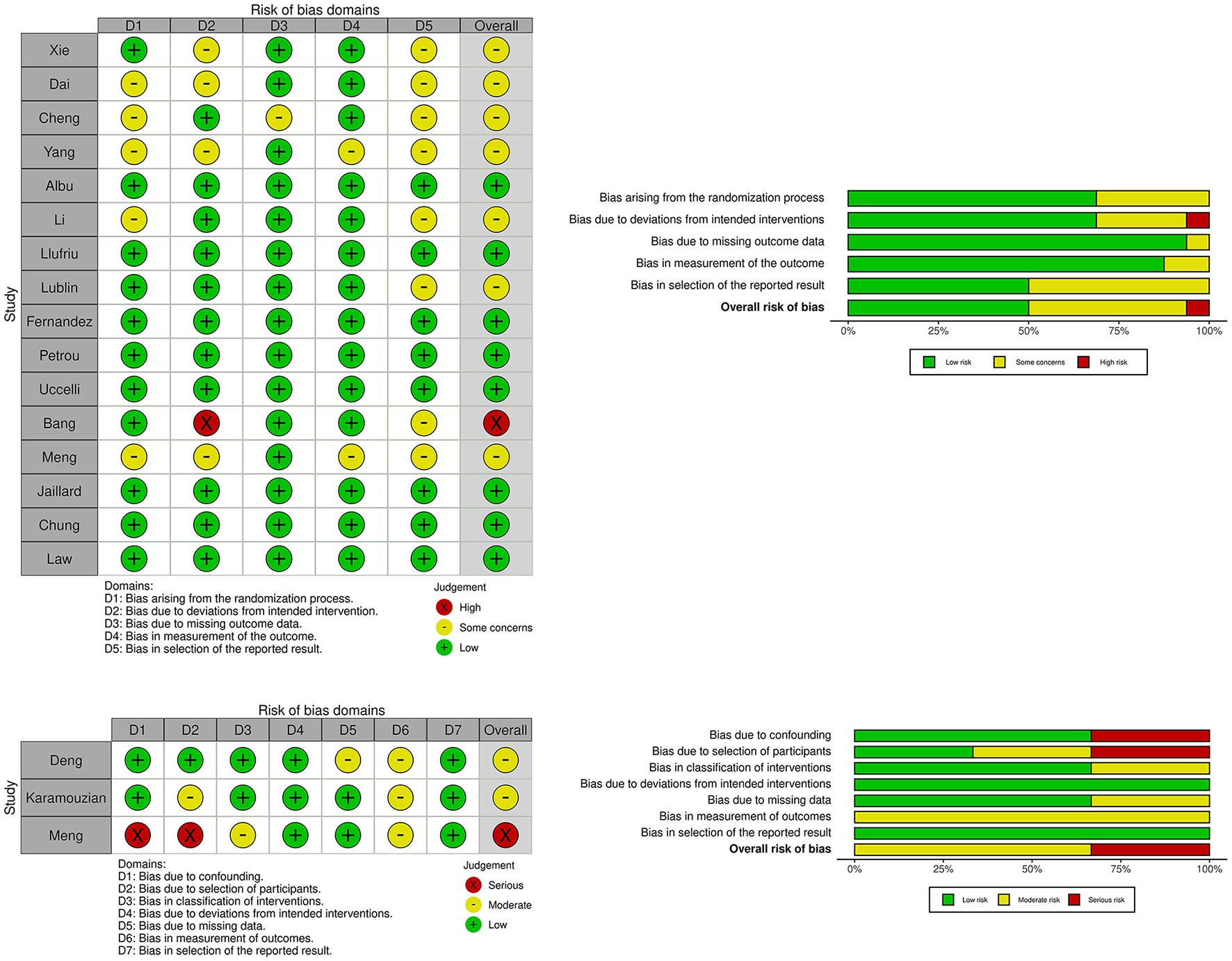 Plots showing risk of bias for controlled studies assessing efficacy of mesenchymal stem cell treatment in traumatic spinal cord injury, multiple sclerosis and ischemic stroke. Risk of bias for randomized studies (16 studies). Risk of bias for non-randomized studies (3 studies).