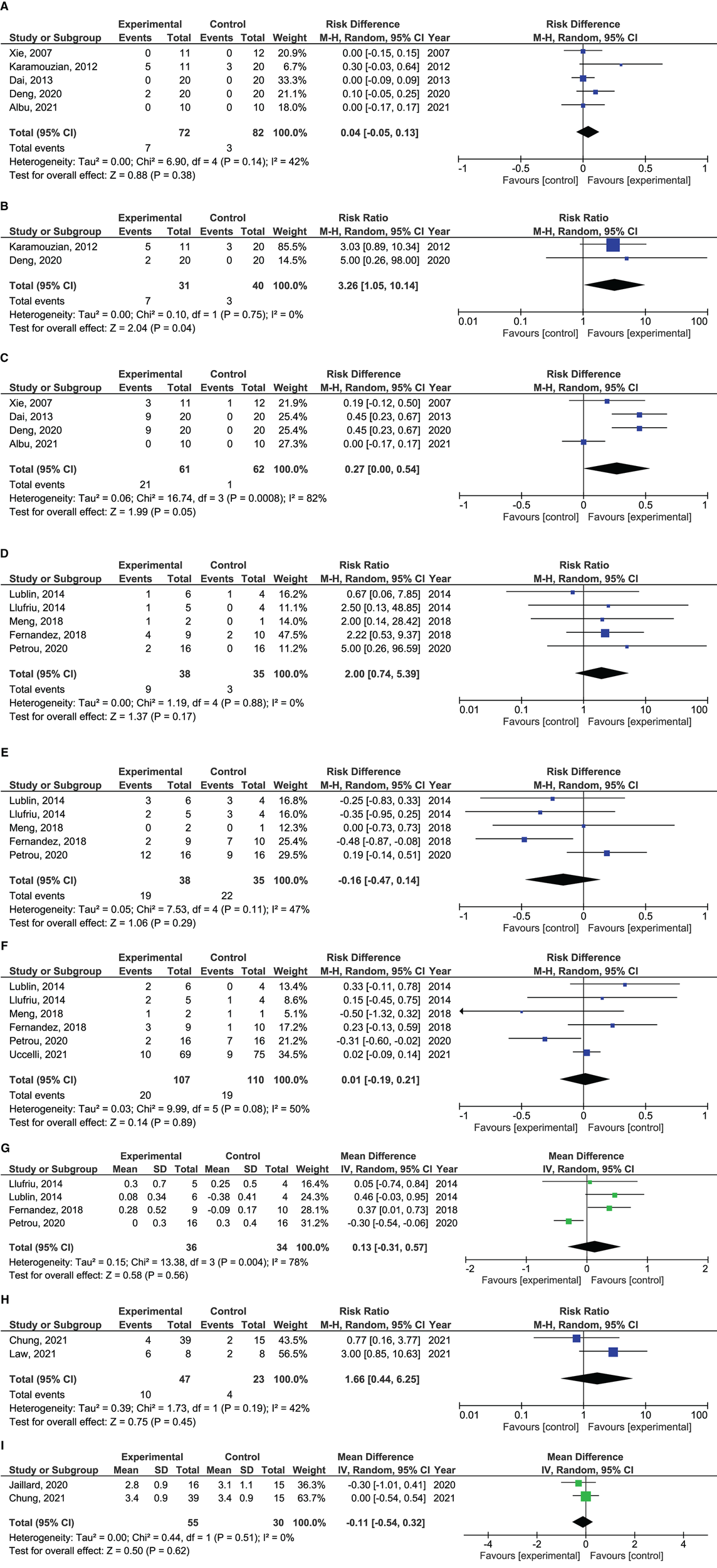 Safety data was registered by type and severity, and reported in frequency per procedure. Meta-analyses for dichotomous efficacy outcomes were performed by computing relative risks and risk differences with corresponding 95% confidence intervals using the Mantel-Haenszel method in a random effects model. For ordinal data, differences in mean were calculated with corresponding 95% confidence intervals using the inverse variance method in a random effects model. The random effects model was applied based on the assumption that the different studies were estimating different, yet related, intervention effects. Intention-to-treat data from the studies were used. If studies had multiple treatment arms with different doses of MSCs and only one control arm, the arm with the highest dose showing safety, was used in the meta-analysis of efficacy as comparison to the control group. Likewise, if studies used both intravenous and intrathecal administration modes, the arm with the intrathecal administration was used in the meta-analysis as comparison to the control group. Heterogeneity was assessed by using the inconsistency index (I2). Risk of bias across studies was not assessed due to the low number of studies available for each outcome analysis. No additional analyses were performed apart from subgroup analyses as specified in the protocol. Revman 5.4.1 software (Cochrane Collaboration, Oxford, UK) was used for the analyses.