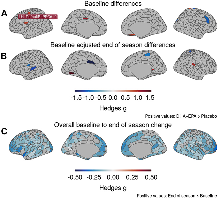 Briefly, eligible participants were University of Arizona NCAA football players, age ≥18 years, cleared to participate in university athletics as determined by the team physician, and who volunteered to participate in the trial. Exclusionary criteria included (1) chronic use of anti-inflammatory medications (≥20 days); (2) antihypertensive medication use; (3) lipid-lowering medication use; active fish oil or omega-3 fatty acid supplementation; (4) self-reported consumption of more than two servings of fish per week; (5) injured or unable to participate in regularly scheduled conditioning or competitions; and (6) recent diagnosis of acute concussion. Where possible, exclusionary criteria were confirmed by sports medicine staff from student-athlete medical records. Furthermore, individuals sustaining a diagnosed concussion at any time during the trial were removed from participation. Enrolled participants were randomized to either the placebo or treatment group in a 1:1 ratio, counterbalanced by starter status based on the preceding season and estimated risk of RSHI by position (44). There were no changes in starter status over the course of the season for those participating in the trial. Finally, participants were included in the present analyses when both baseline and end of season neuroimaging sessions were available.
