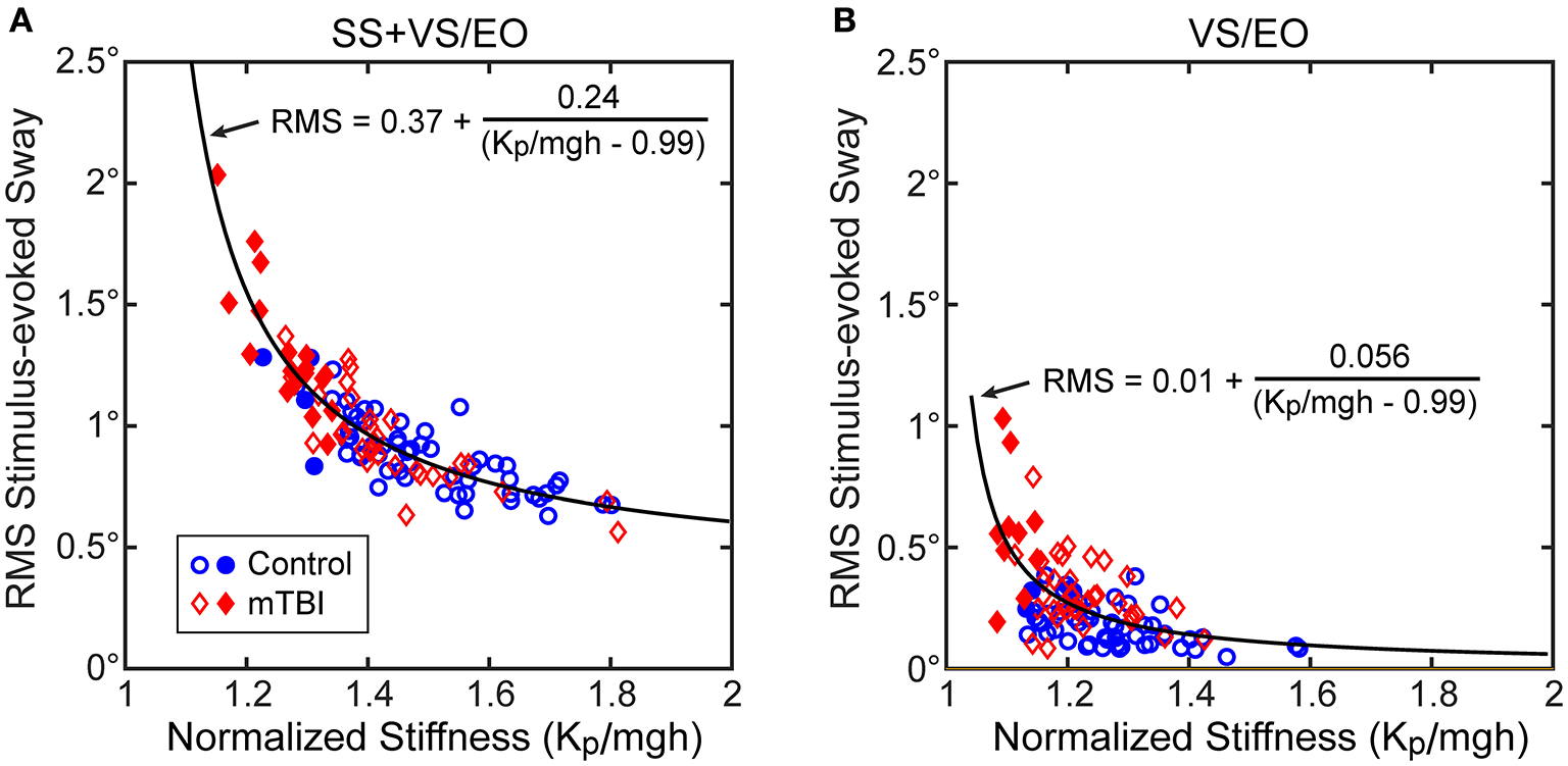 Below we first describe various sway measures to provide an overview of the magnitude of sway evoked in the four CSMI stimulus conditions and the variability of that sway about the mean. The CSMI model parameters are then cataloged with significant differences between mTBI and HC measures identified. The relationship between the stimulus-evoked sway and the identified model parameters is described to facilitate an understanding that evoked sway depends on both sensory integration and motor activation properties. The unexpected presence of long time delays in mTBI subjects and their relationship with motor activation stiffness is characterized. Finally, the relationships between CSMI and SOT measures of balance are evaluated with particular regard to whether CSMI results can give insight into the causes of the Aphysiologic SOT performance pattern.
