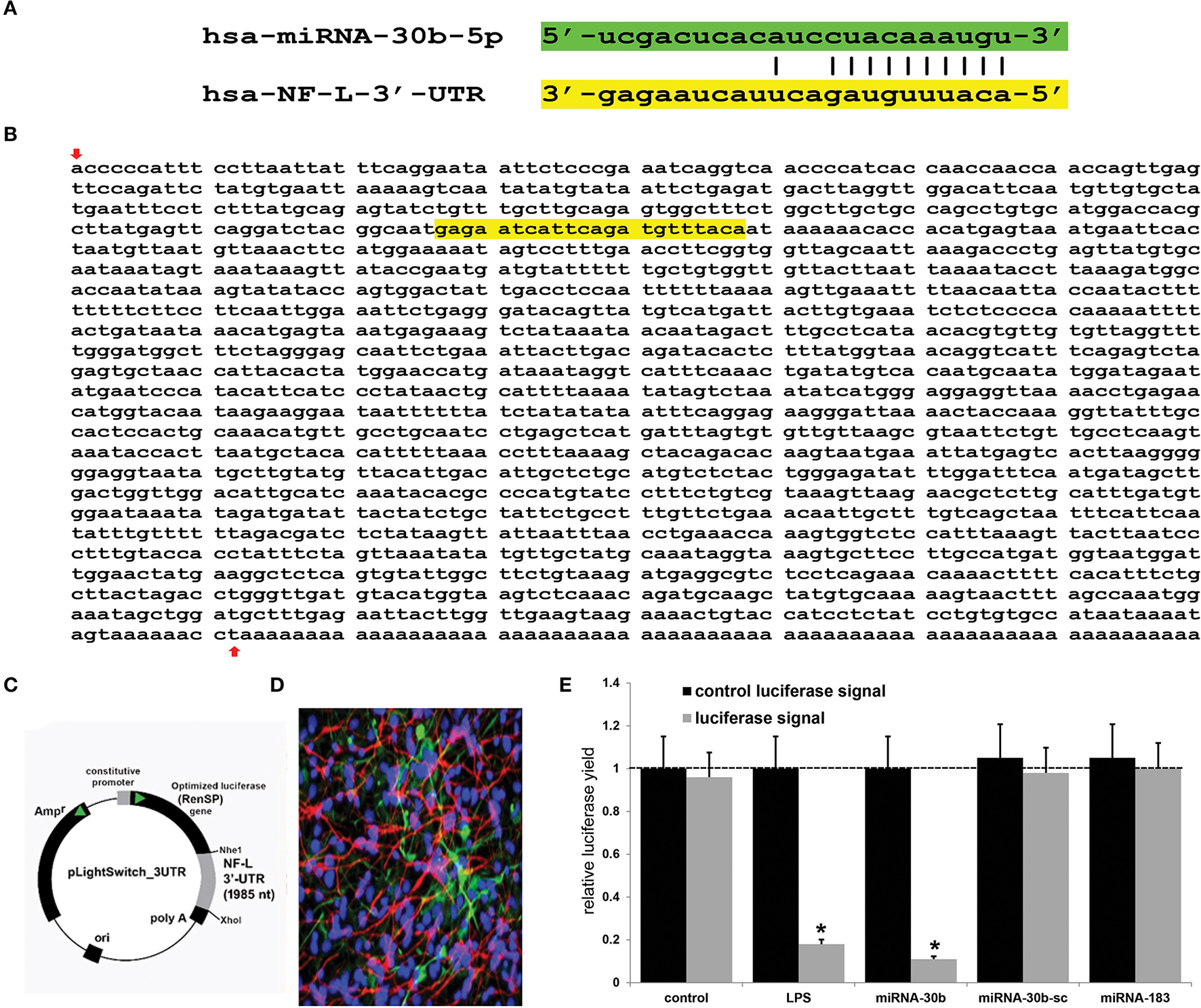 Analysis of the hsa-miRNA-30b-5p (miRNA-30b) interaction with the Homo sapien NF-L 3'-UTR; (A) representation of the nucleotide complementarity between the 22 nucleotide (nt) hsa-miR-30b-5p (highlighted in green; encoded at the miRNA-30 gene cluster on human chromosome (chr) 8q24.22; https://www.genecards.org/cgi-bin/carddisp.pl?gene=MIR30B) and nt position 266–287 of the NF-L mRNA 3'-UTR non-coding region (highlighted in yellow; encoded at human chr 8p21.1; https://www.genecards.org/cgi-bin/carddisp.pl?gene=NEFL); the microRNA target prediction database (miRDB; http://mirdb.org/cgi-bin/targetdetail.cgi?targetID=2099169; last accessed April 24, 2022) for miRNA-30b and NF-L (NEFL; NCBI Gene ID 4747; GenBank Accession NM_006158) indicates a very high miRNA-mRNA target score of 84 and a strong 10 nt ‘seed' sequence location at 278-287 nt of the NF-L 3'-UTR [see also “(B)” below]; (B) the NF-L 3'-UTR gene sequence; the inverted red arrow indicates the start of the NF-L 3'-UTR non-coding sequence; last upward pointing red arrow is the end of the NF-L 3'-UTR; note that additional adenosine groups are present in the mature NF-L mRNA (and 3' end of the NF-L 3'-UTR); (C) the NF-L-mRNA-3′-UTR expression vector luciferase reporter assay (pLight Switch-3′UTR; Cat#S810535; Switchgear Genomics, Palo Alto CA); in this vector, the entire 1,985 nucleotide NF-L 3′-UTR was ligated into the unique Nhe1-Xho1site; not drawn to scale; (D) human neuronal-glial (HNG) cells, 2 weeks in primary culture; neurons (red stain; λmax = 690 nm), DAPI (blue nuclear stain; λmax = 470 nm) and glial fibrillary associated protein (GFAP; glial-specific green stain; λmax = 520 nm); the HNG cell culture is about 60% confluent and at 2 weeks of culture contains about 70% neurons and 30% astroglia (7, 14, 18, 39, 40, 49); human neurons do not culture well in the absence of glia; neurons also show both extensive cytoarchitecture and display electrical activity (unpublished; Lonza Research and Development, Walkersville MD, USA); 40X magnification; HNG cells transfected with the NF-L-mRNA-3′-UTR expression vector luciferase reporter were treated exogenously with LPS (20 ng/ml cell culture medium, 48 hr), a stabilized miRNA-30b, a scrambled control miRNA-30b (miRNA-30b-sc) or control miRNA-183; see (14, 18, 39, 49) and text for further details on all reagents and methods used in these experiments; (E) compared to control, HNG cells transfected with a scrambled (sc) control pLightSwitch-3'-UTR vector, the NF-L-mRNA-3′-UTR vector exhibited decreased luciferase signal to a mean of 0.18-fold of controls in the presence of exogenous LPS and 0.11 in the presence of miRNA-30b; this same vector exhibited no change in relative luciferase yield in the presence of a control miRNA-30b-sc or miRNA-183; for each experiment (using different batches of HNG cells) a control luciferase signal was generated that included separate controls with each analysis; in addition a control vector β-actin-3′-UTR showed no significant effects on the relative luciferase signal yield after treatment with either miRNA-183 or miRNA-30b (data not shown); a dashed horizontal line set to 1 is included for ease of comparison; N = 5; *p < 0.01 (ANOVA); values represent mean +/- 1 standard deviation (S.D.); Microsoft Excel Analysis ToolPak, Excel for Microsoft 365; https://support.microsoft.com/en-us/office/use-the-analysis-toolpak-to-perform-complex-data-analysis-6c67ccf0-f4a9-487c-8dec-bdb5a2cefab6. The results suggest a physiologically relevant miRNA-30b-NF-L-mRNA-3′-UTR interaction and a miRNA-30b-mediated downregulation of NF-L expression in HNG cells. This pathogenic interaction may be related to the downregulation of other immune, inflammatory, and synaptic system genes by upregulated miRNAs in the CNS resulting in a deficit in cytoskeletal and synaptic organization and trans-synaptic signaling (7, 21, 26, 27, 31, 32, 36, 38–40, 50).