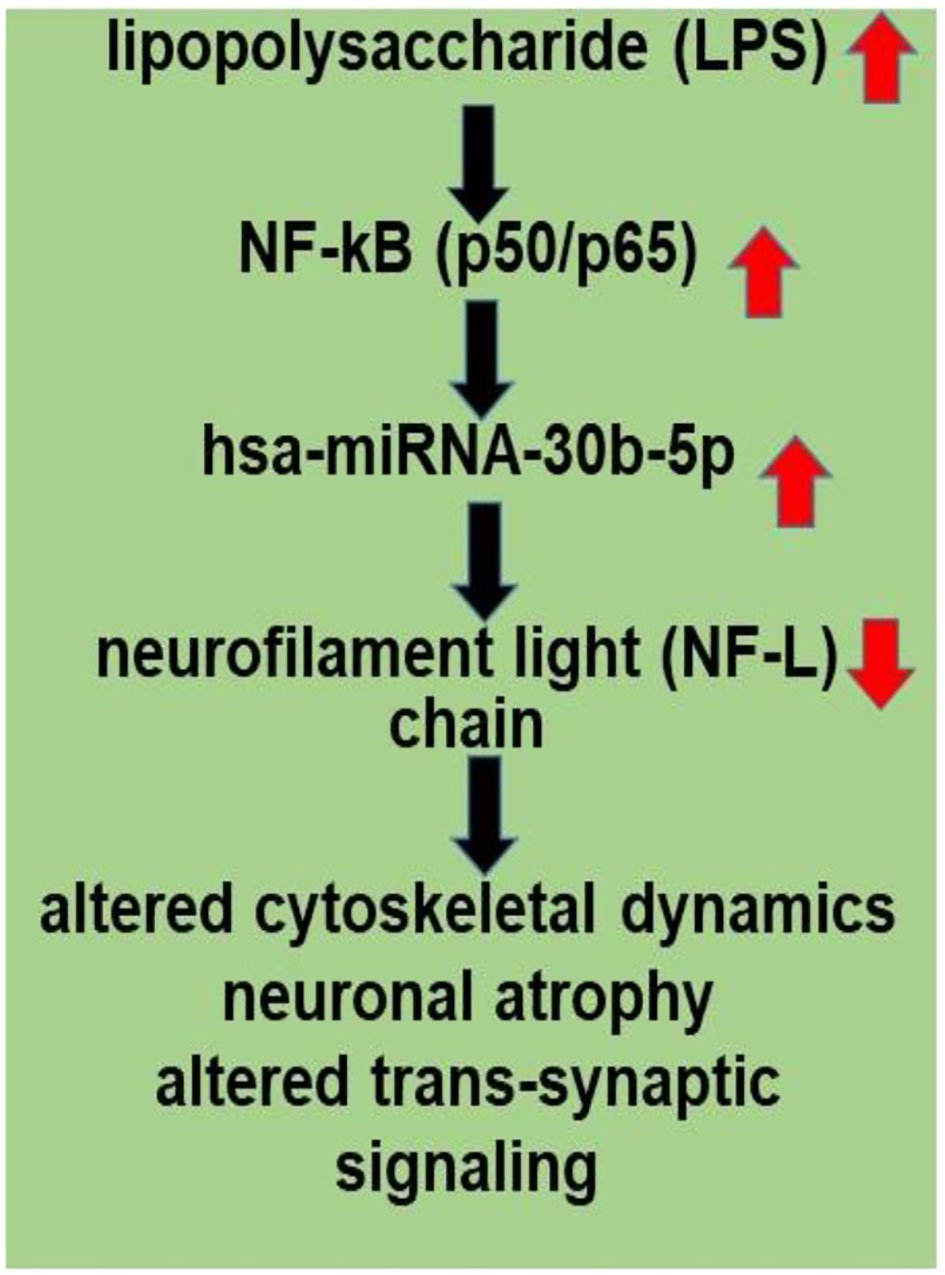 This “Perspectives” paper ties together several recent observations linking increased LPS and LPS-induced NF-kB signaling with increases in a pathogenic human CNS-enriched NF-kB-sensitive microRNA-30b. We provide the first evidence that increased miRNA-30b is capable of targeting the 3'-UTR of the neuron-specific neurofilament light (NF-L) chain messenger RNA (mRNA), thus linking this action to the decreased expression of NF-L, a cytoskeletal element known to be downregulated within CNS neurons in AD affected brain, in stressed HNG cells in primary culture and in transgenic murine models of AD (14–21). In doing so, NF-L depletion disrupts normal neuronal cell shape, cytoarchitecture, and synaptic organization. This is the first example of a microbiome-initiated pathogenic pathway linking LPS, an abundant microbial glycolipid neurotoxin, with the miRNA-mediated downregulation of an essential neuron-specific cytoskeletal component normally required to maintain the cytoarchitecture and signaling functions of the neuron.