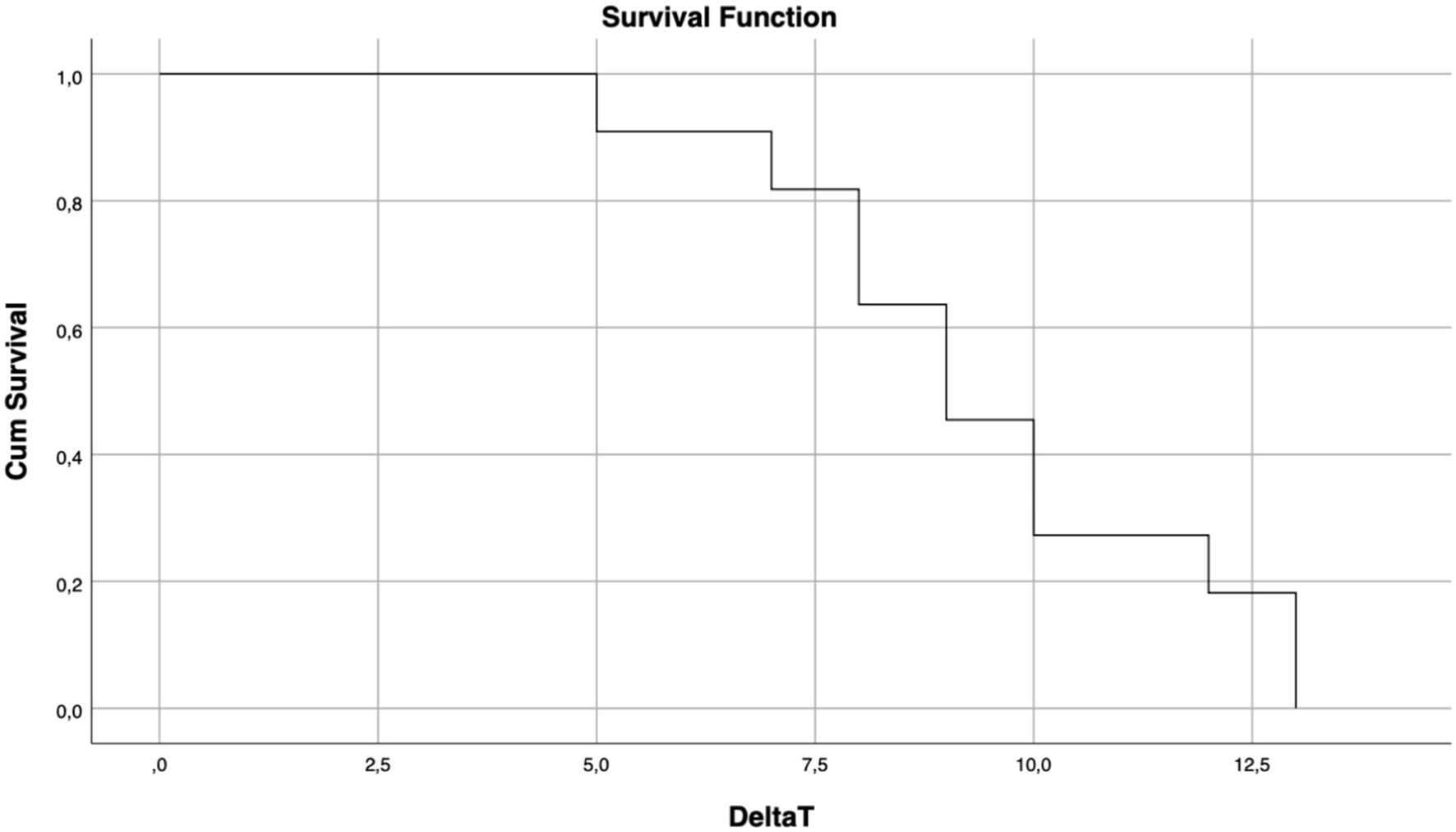 For the statistical analysis of quantitative variables, we evaluated mean, median, and standard deviations, which were compared through t-tests. To study the relationship between these variables, the Pearson correlation coefficient was calculated. We described the most relevant correlations with a scatter plot and regression line, calculating the regression coefficient, and the coefficient of determination. The Fisher exact test was employed for the analysis of categorical variables which were expressed as percentages,. Finally, we described the overall survival rates through Kaplan –Meier curves (Figure 1). We used IBM SPSS, ver. 26. for the statistical analysis.