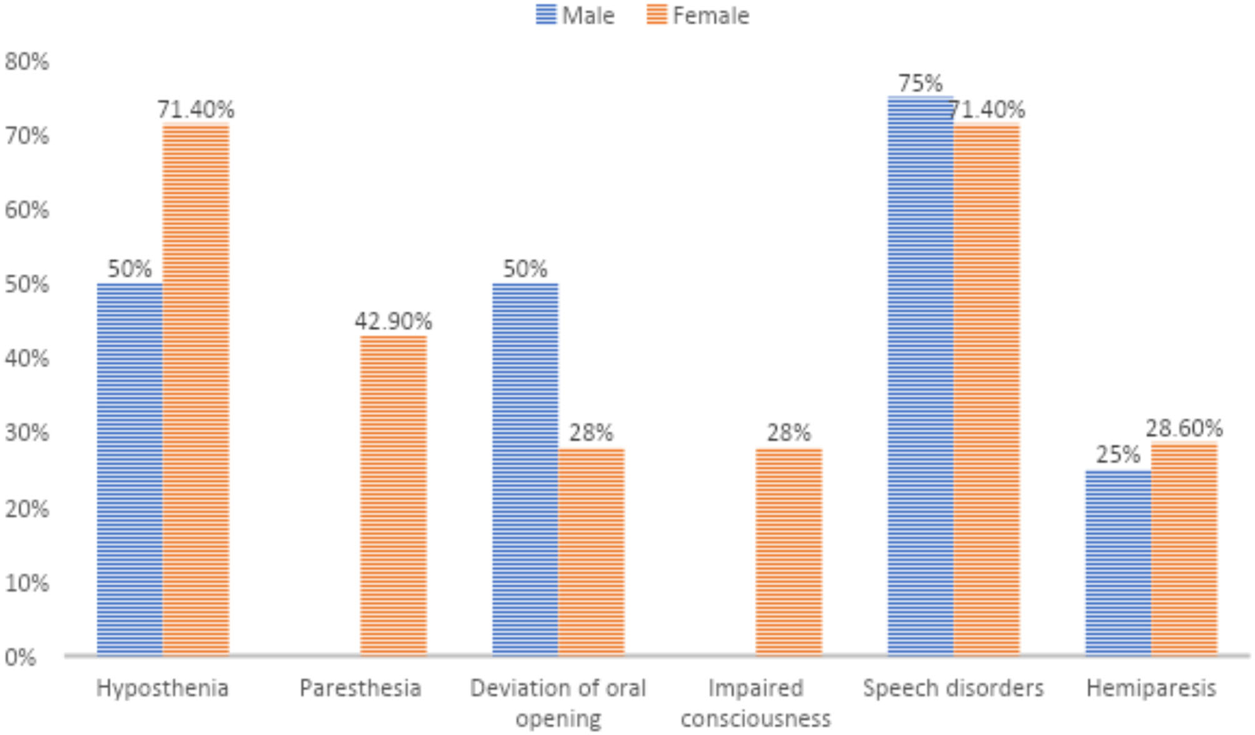 The analysis of these symptoms revealed a different gender distribution: limb hyposthenia occurred in 5 (71.4%) women and in 2 (50%) men; no men presented paraesthesia while buccal opening and/or tongue deviation manifested in 28% of females and 50% of males. Impaired consciousness was not observed in men, whereas it occurred in 28% of women (Figure 2).