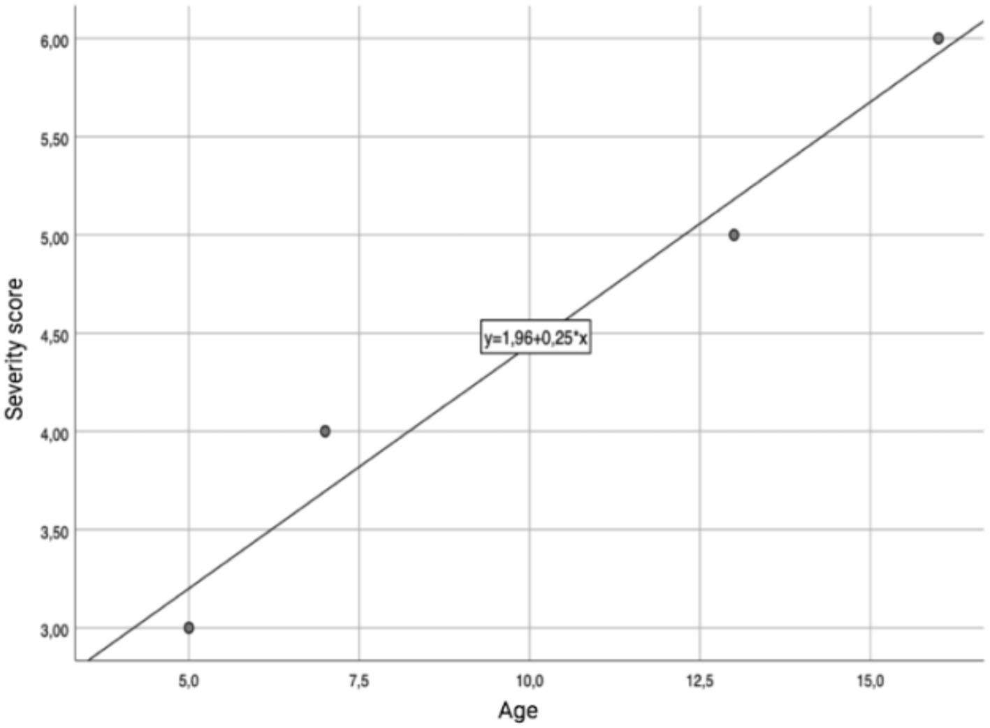 We did not observe any correlation between the severity of the clinical picture and the age of the female patients, or with the administration modality. On the other hand, a significant correlation was detected in the male subgroup, in which age showed a linear correlation with the severity of the clinical picture (r: 0.98; p-value: 0.017), as shown in Figure 3. A trend toward a linear correlation was also observed between severity and the time elapsed since the last administration of MTX (Figure 4), although no statistical significance has been detected (r: 0.56; p-value: 0.71).