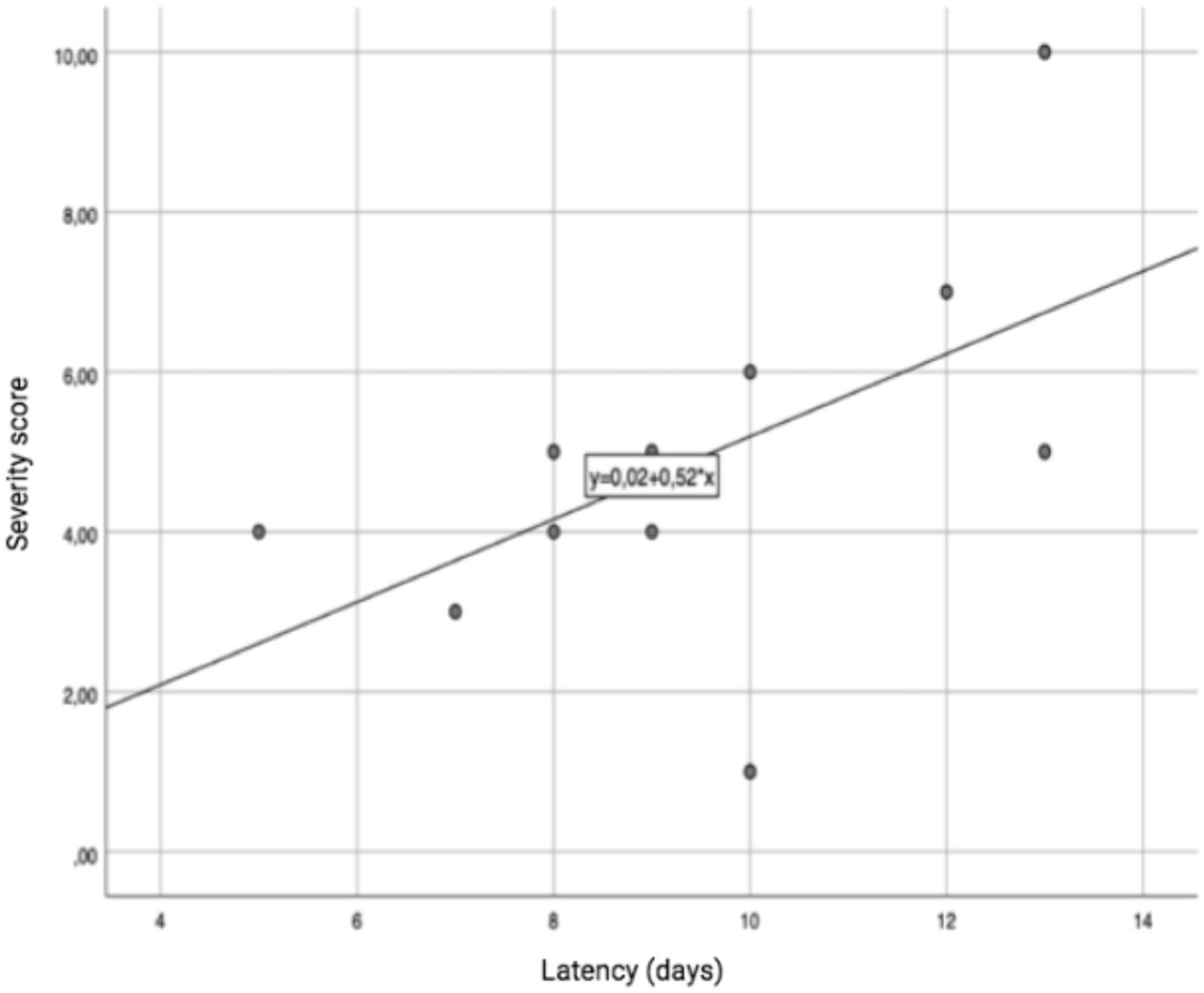 Our analysis displayed a severity score ranging from 1 to 10, with a mean value of 4.9 (± 2.3), and a median of 5.