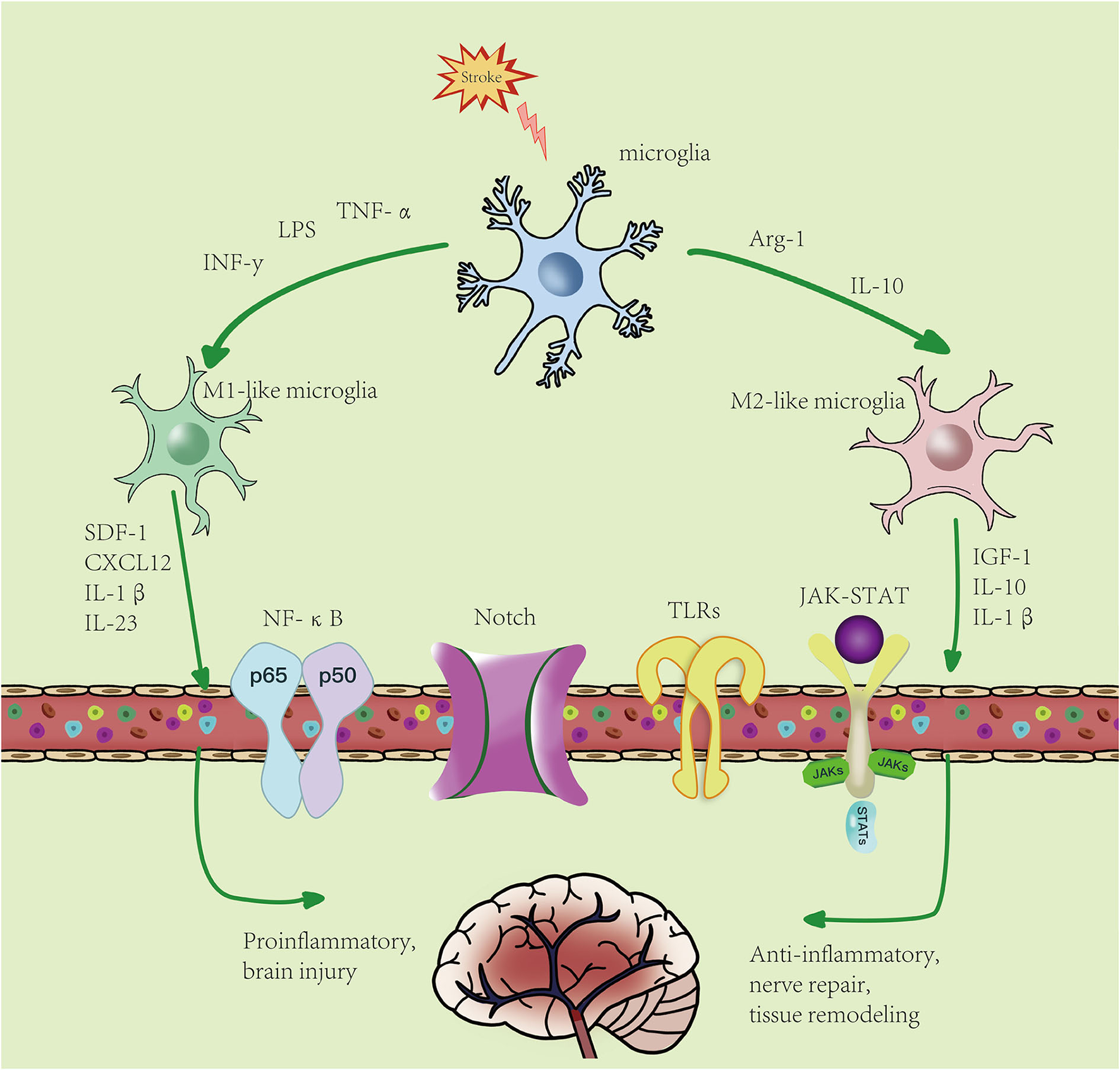 Microglial polarization after stroke: microglial activation is divided into two phenotypes: M1-like and M2-like microglia. M1 microglia can be induced by lipopolysaccharides (LPS), interferon-γ (IFN-γ), etc., resulting in an increase in pro-inflammatory factors. M2-like microglia can be induced by IL-4, IL-13, etc., resulting in an increase in anti-inflammatory factors. Activated microglia pass through NF-κB, JAK-STAT, Notch, TLRs, and other signaling pathways. M1-like type promotes the inflammatory response and kills intracellular substances, while M2-like type plays an anti-inflammatory, neuroprotective, and repairing role in tissues.