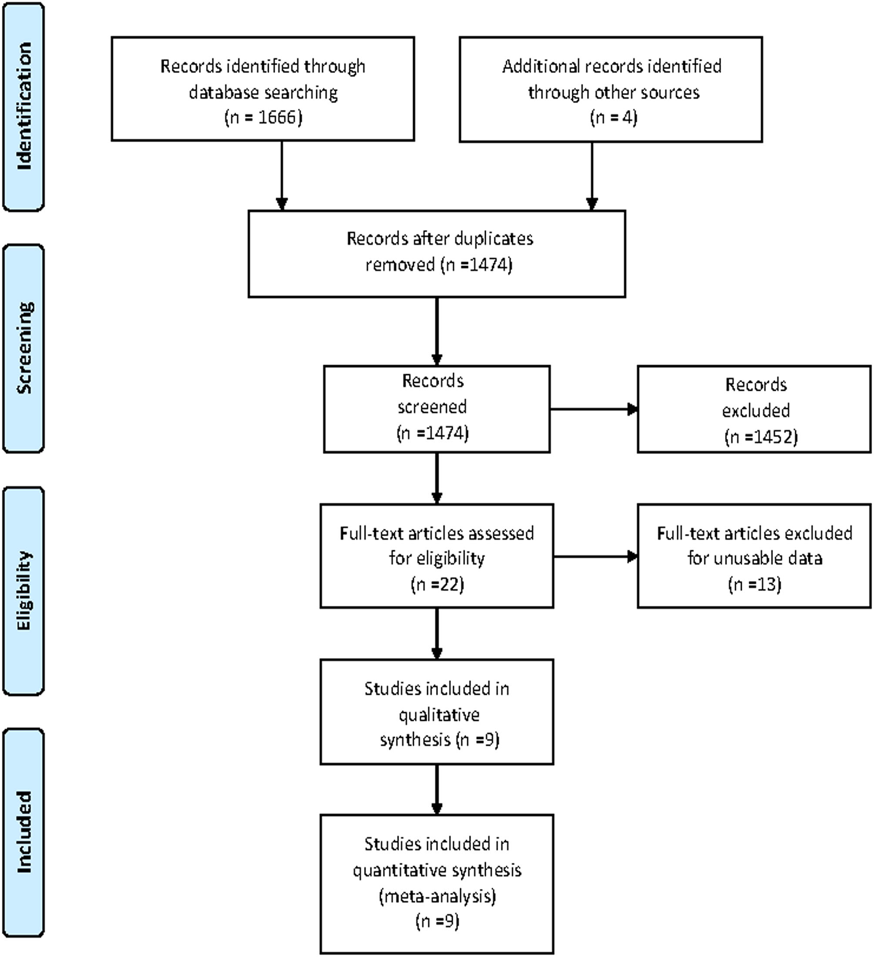 A total of 1,670 articles were retrieved from the databases: 109 articles from PubMed, 1,307 articles from Ovid, 20 articles from the Cochrane Library, 230 articles from Web of Science and 4 additional studies from the related references. After screening the titles and abstracts and excluding duplicates, 22 remaining records seemed to be relevant to this study. After reviewing the full-text articles, nine articles (5–11, 14, 15) were included in this meta-analysis. The flowchart for the search and selection results is shown in Figure 1.