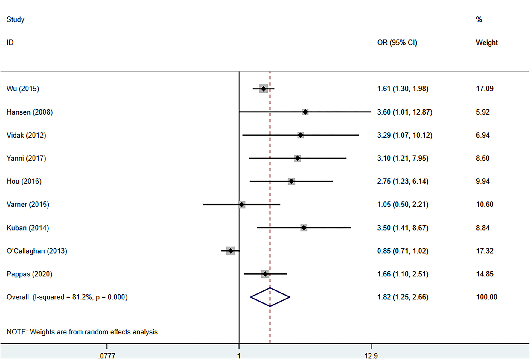 | Total | 9 | 1.82 (1.25–2.66) | 81.2% (p=0.000) | |
