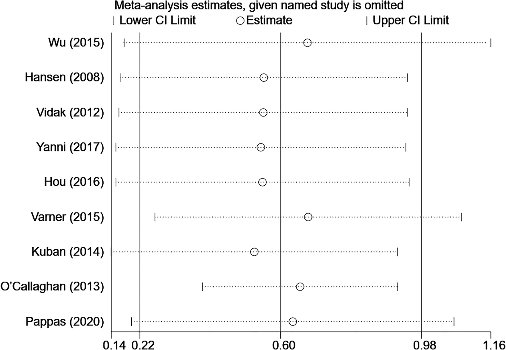 Sensitivity analysis for individual studies on the summary effect.