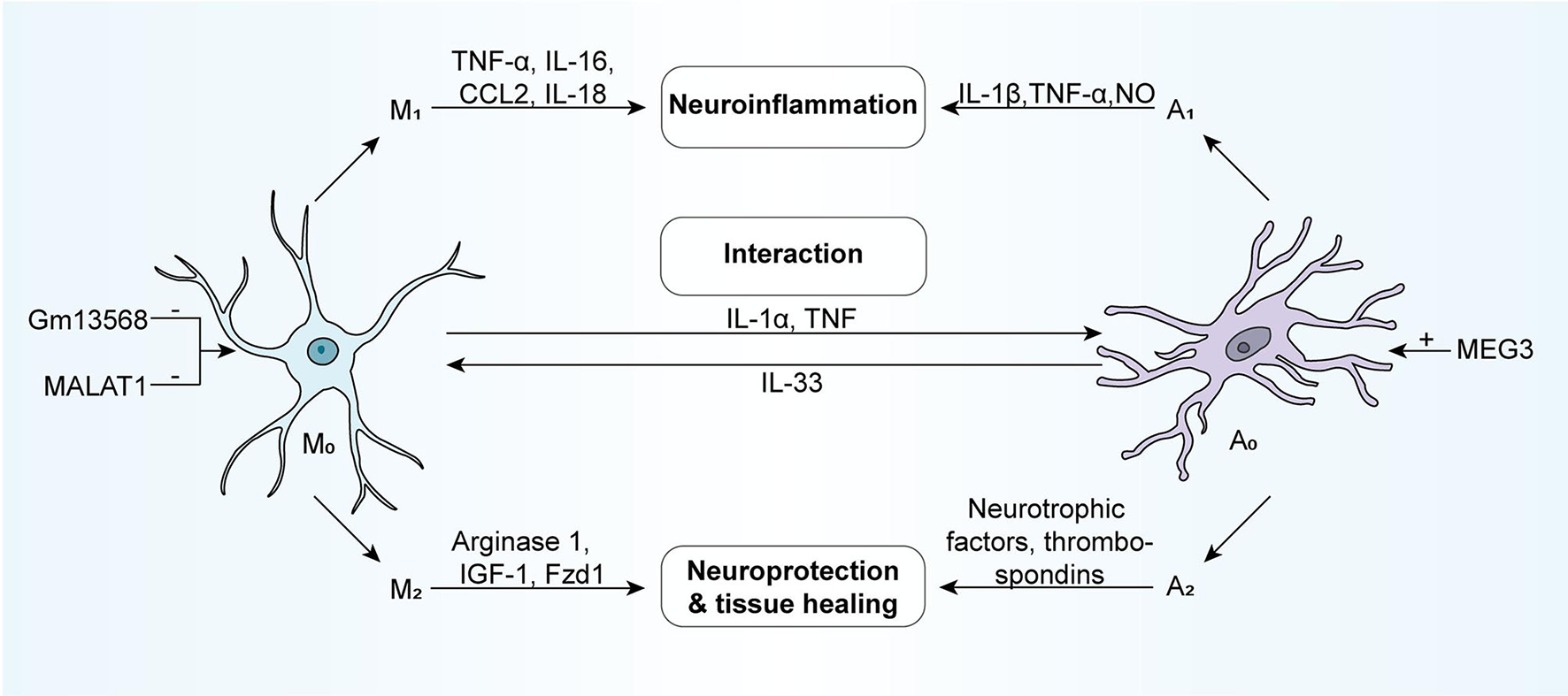 NcRNAs can involve in the regulatory processes of the activation of microglia and astrocyte. Generally, microglia and astrocytes respond to external stimuli as a whole, functionally restricting each other and coordinating with one another. According to activation status, they are usually divided into two phenotypes: the neurotoxic phenotype (M1/A1) and the neuroprotective phenotype (M2/A2). The neurotoxic microglia, which secretes pro-inflammatory cytokines (e.g., TNF-α, IL-16, and so forth) and chemokines (e.g., CCL2, IL-18, and so forth), participate in neuroinflammation. While the neuroprotective microglia could release Arginase 1, IGF-1, Fzd1, and so forth, contributing to neuroprotection and tissue healing. The neurotoxic astrocytes induce the production of pro-inflammatory factors such as IL-1β, TNF-α, NO, and so forth, while neuroprotective astrocytes secrete neurotrophic factors and thrombospondins in large quantities. Astrocytes and microglia can directly interact with one another via molecules like IL1a, TNF, and IL-33. M1, neurotoxic microglia; A1, neurotoxic astrocyte; M2, neuroprotective microglia; A2, neuroprotective astrocyte; IGF-1, insulin-like growth factor 1; Fzd1, Frizzled-1.