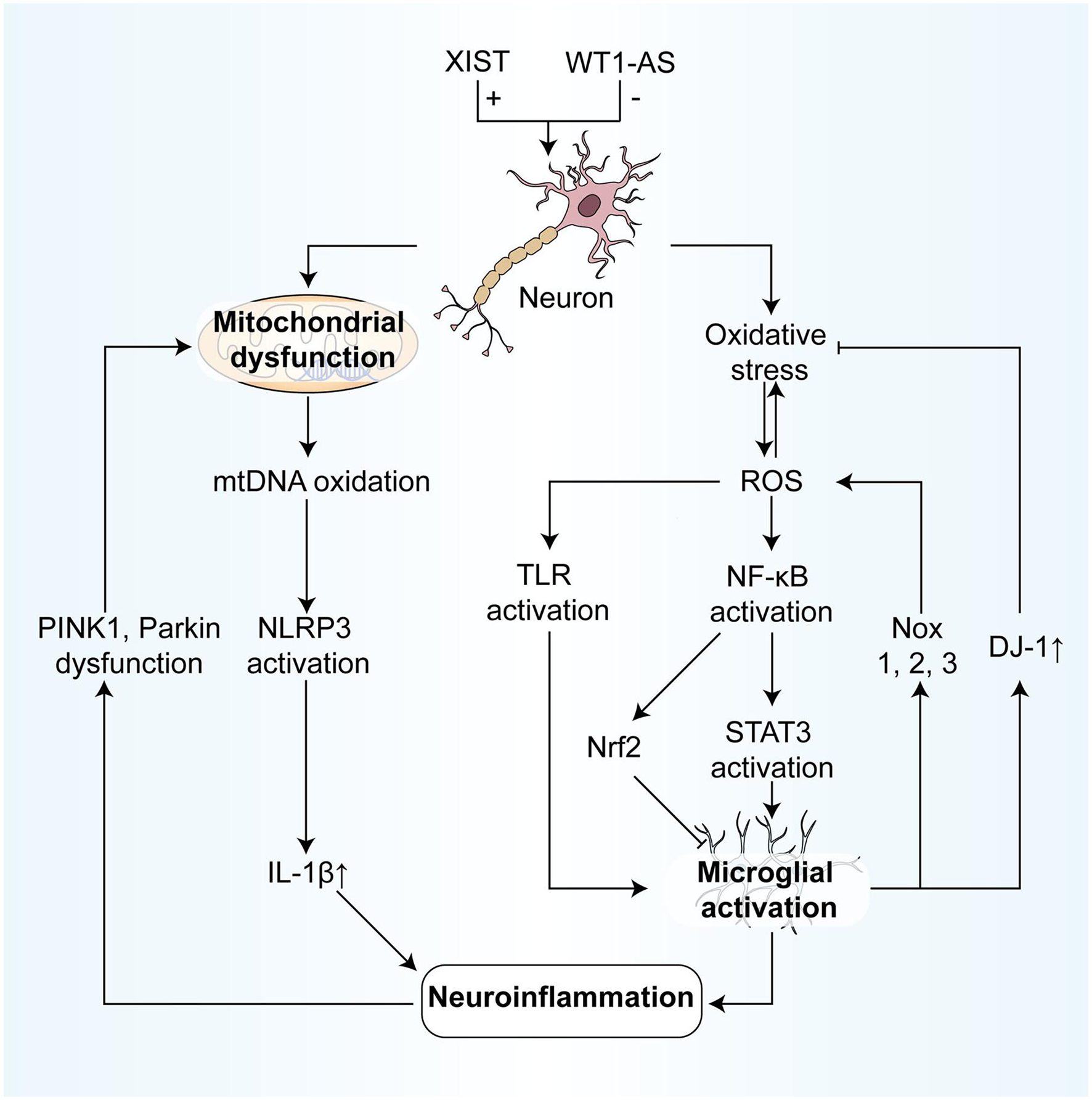 NcRNAs participate in the association between oxidative stress and neuroinflammation, regulating parts of the process. On the one hand, the process from oxidative stress to neuroinflammation includes: (1) ROS modifies and activates TLRs, resulting in the inflammatory response of microglia; (2) ROS degrades IκB and promotes NF-κB activation, which in turn activates STAT3, finally leading to microglia activation to participate in neuroinflammation. (3) Also, after NF-κB is activated by ROS, the activation of Nrf2 can inhibit the microglia activation, resulting in anti-inflammatory effects. (4) Mitochondrial oxidative mtDNA mediates the activation of the NLRP3 inflammasome, resulting in the production of IL-1β, and in turn, induces neuroinflammation. On the other hand, the effects of neuroinflammation on oxidative stress include: (1) Activated microglial cells can not only produce the large expression of NOX1, 2,3, inducing oxidative stress but also inhibit oxidative stress by expressing large quantities of DJ-1. (2) In neuroinflammation, the dysfunction of PINK 1 and Parkin leads to mitochondrial autophagy blockage, and then results in mitochondrial dysfunction and cell apoptosis. IκB, IkappaB kinase; NF-κB, nuclear factor kappa-light-chain-enhancer of activated B cells; Nrf2, Nuclear factor-erythroid factor 2-related factor 2; NOX, NADPH oxidase; PINK 1, PTEN-induced kinase 1.