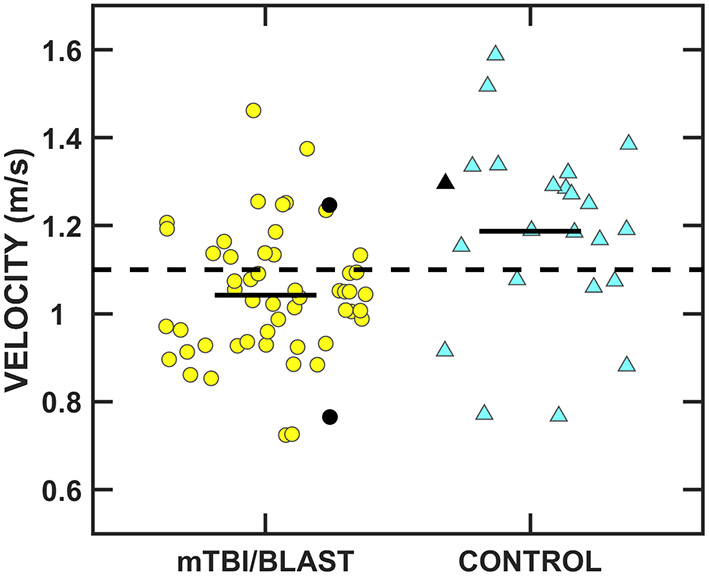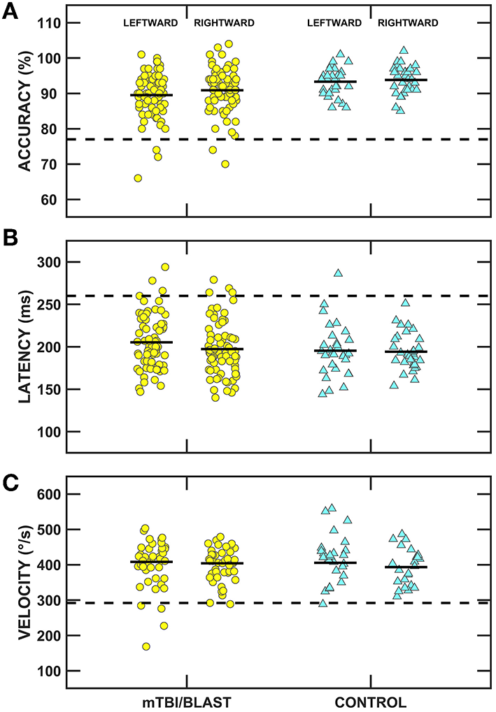 Scatterplots of accuracy (A), latency (B), and velocity (C) for leftward and rightward randomized saccades. Yellow circles represent individual data for participants with mTBI/blast, the blue triangles represent individual data for the healthy controls, and the black horizontal bars indicate group means. The dashed horizontal lines show the clinical cutoffs for: (panel A) mean accuracy (<77 or >137%) and (panel B) mean latency (>260 ms) for all saccadic eye displacements (5 to 25°), and (panel C) velocity for 18-25° saccadic eye displacements (<292°/s).