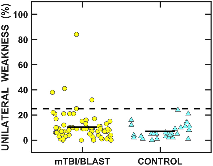 Vestibular, ocular motor, and balance test findings were categorized as normal or abnormal for each participant using established clinical cut-offs (published and laboratory normative data). These cut-offs are defined for each test described above and shown in each scatterplot figure for the test variables used to define a normal or abnormal test finding.