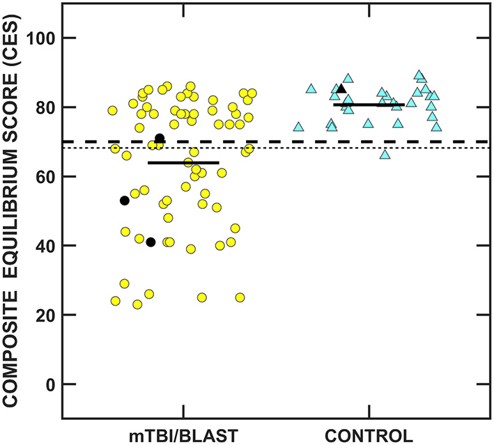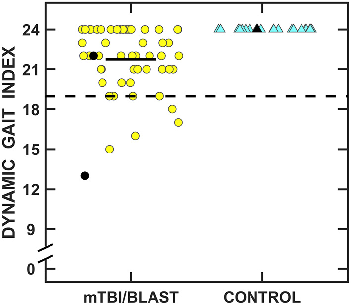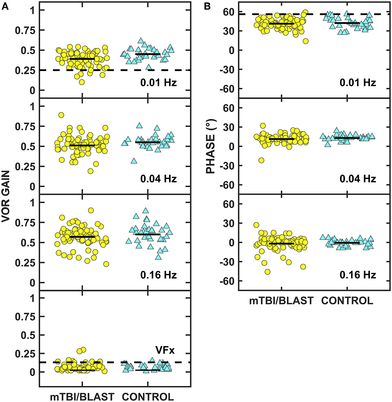 Scatterplots of gain for sinusoidal tracking at (A) 0.1 Hz, (B) 0.2 Hz, and (C) 0.4 Hz. Yellow circles represent individual data for participants with mTBI/blast, the blue triangles represent individual data for the healthy controls, and the black horizontal bars indicate group means. The dashed horizontal lines on each panel show the clinical cutoffs for gain at 0.1 Hz (<0.66), 0.2 Hz (<0.7), and 0.4 Hz (<0.64).
