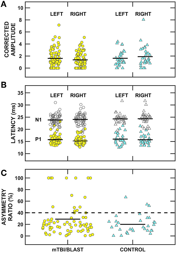 The ARs range from 100% to 0% with values near 0% indicating that P1-N1 amplitudes are symmetrical. The criterion for abnormal cVEMP was defined as an absent cVEMP at 125 dB peakSPL and/or a corrected cVEMP amplitude asymmetry ratio ≥40% or present cVEMP response at 94 dB peakSPL (laboratory normative data).