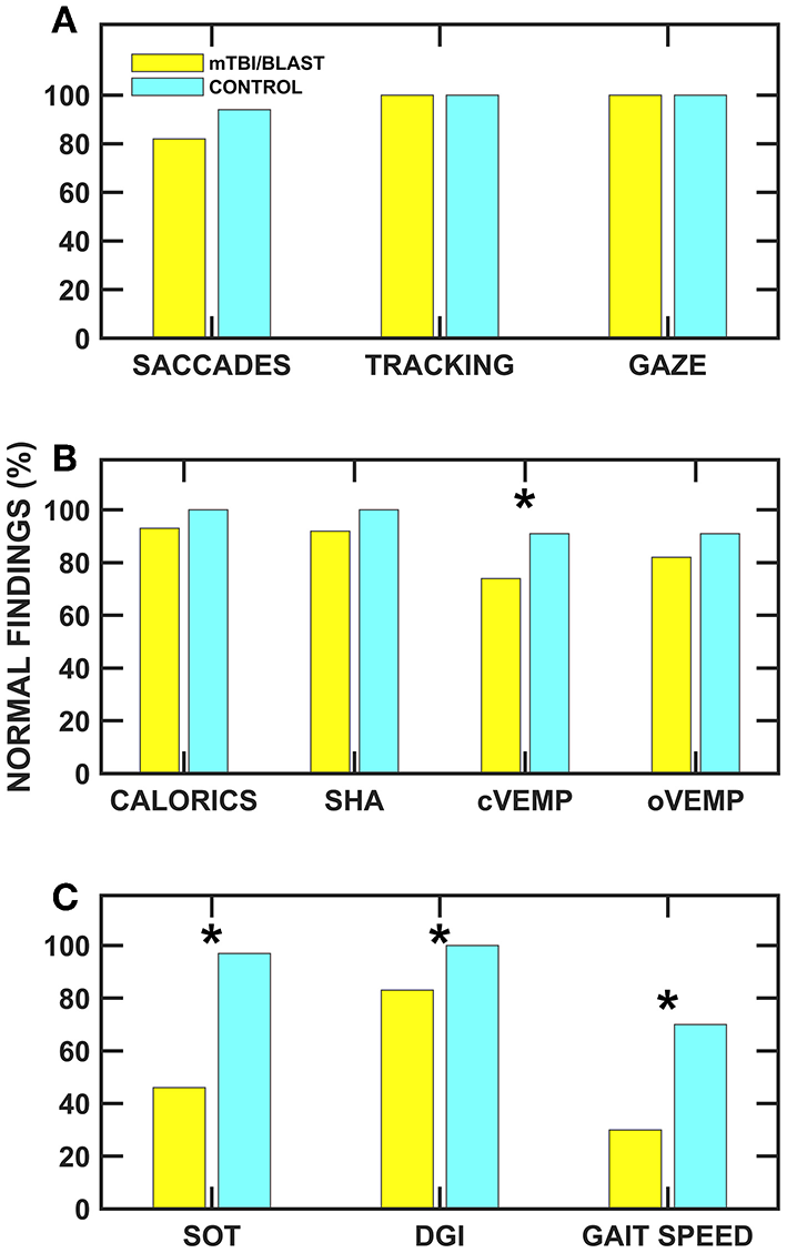 The purpose of this study was to examine vestibular and balance function in individuals with chronic dizziness associated with mTBI/blast. We hypothesized that individuals with mTBI/blast and dizziness will have decreased vestibular function and postural stability compared to healthy controls. We also hypothesized that the sacullo-collic pathway (cVEMPs) is particularly susceptible to mTBI/blast compared to the horizontal canal/VOR pathway.